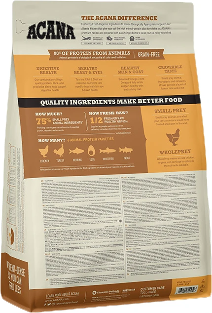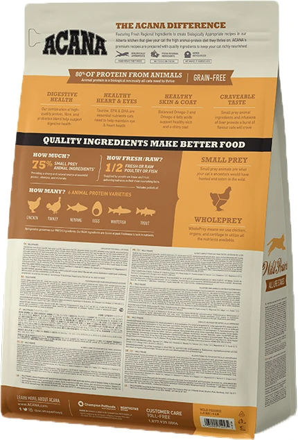 Котам необходимы рационы с богатым содержанием мясных протеинов. Вдохновляясь нашими обширными прериями и кристальными озерами, формула ACANA Wild Prairie переполнена мясными ингредиентами высокого качества: мясом цыплят и индейки, выращенных на вольном выгуле, гнездовыми яйцами и пресноводной рыбой выловленной в дикой природе. Все ингредиенты представлены в соотношении WholePrey, включая мясо, органы, хрящи и съедобные кости, чтоб ваш любимый питомец получал все необходимое для здоровья, отличной физической формы и благополучия.