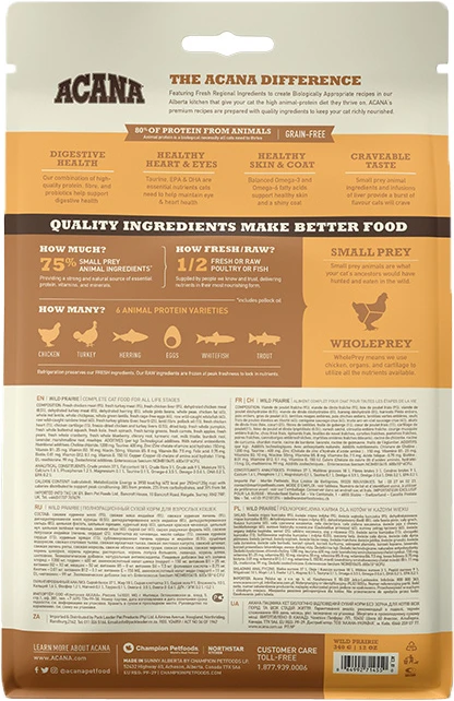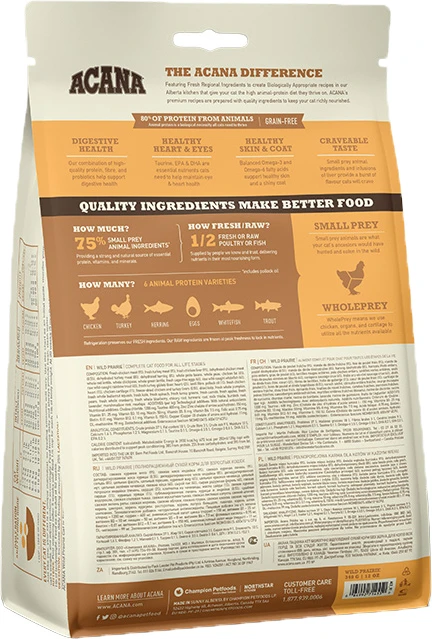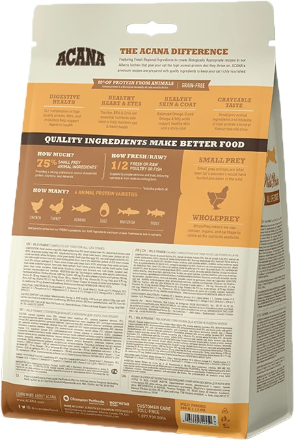 Котам необходимы рационы с богатым содержанием мясных протеинов. Вдохновляясь нашими обширными прериями и кристальными озерами, формула ACANA Wild Prairie переполнена мясными ингредиентами высокого качества: мясом цыплят и индейки, выращенных на вольном выгуле, гнездовыми яйцами и пресноводной рыбой выловленной в дикой природе. Все ингредиенты представлены в соотношении WholePrey, включая мясо, органы, хрящи и съедобные кости, чтоб ваш любимый питомец получал все необходимое для здоровья, отличной физической формы и благополучия.