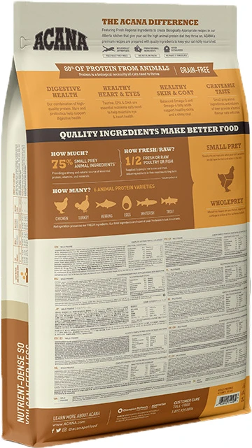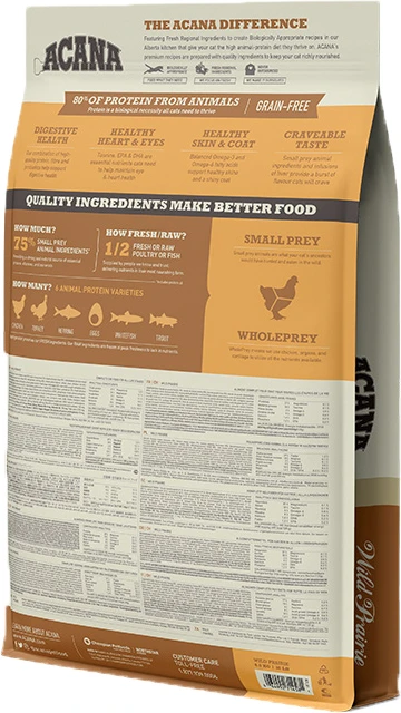 Котам необходимы рационы с богатым содержанием мясных протеинов. Вдохновляясь нашими обширными прериями и кристальными озерами, формула ACANA Wild Prairie переполнена мясными ингредиентами высокого качества: мясом цыплят и индейки, выращенных на вольном выгуле, гнездовыми яйцами и пресноводной рыбой выловленной в дикой природе. Все ингредиенты представлены в соотношении WholePrey, включая мясо, органы, хрящи и съедобные кости, чтоб ваш любимый питомец получал все необходимое для здоровья, отличной физической формы и благополучия.