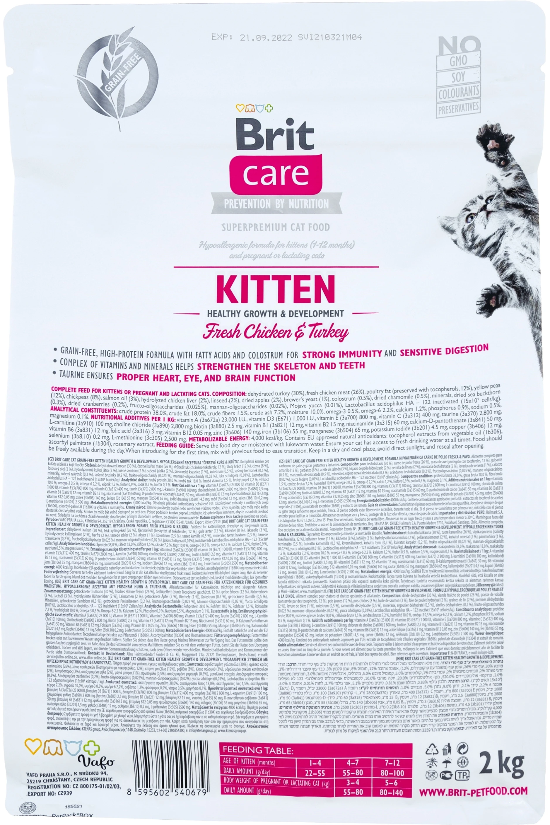 • Беззерновая рецептура с высоким содержанием белка, жирными кислотами и молозивом для сильного иммунитета и чувствительного пищеварения