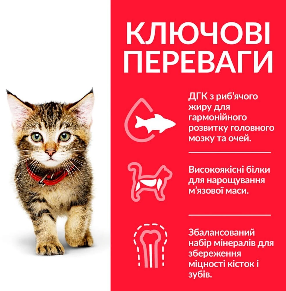 Hill's Science Plan Kitten - полнорационный сухой корм с курицей, для котят до 1 года. Это комплексное сбалансированное питание специально разработанное для укрепления иммунной системы и здорового пищеварения котенка. Рацион содержит омега-3 жирные кислоты, которые способствуют развитию сетчатки и улучшают зрение. Легкоусвояемые белки и сбалансированное количество минералов способствуют развитию и росту вашего котенка.