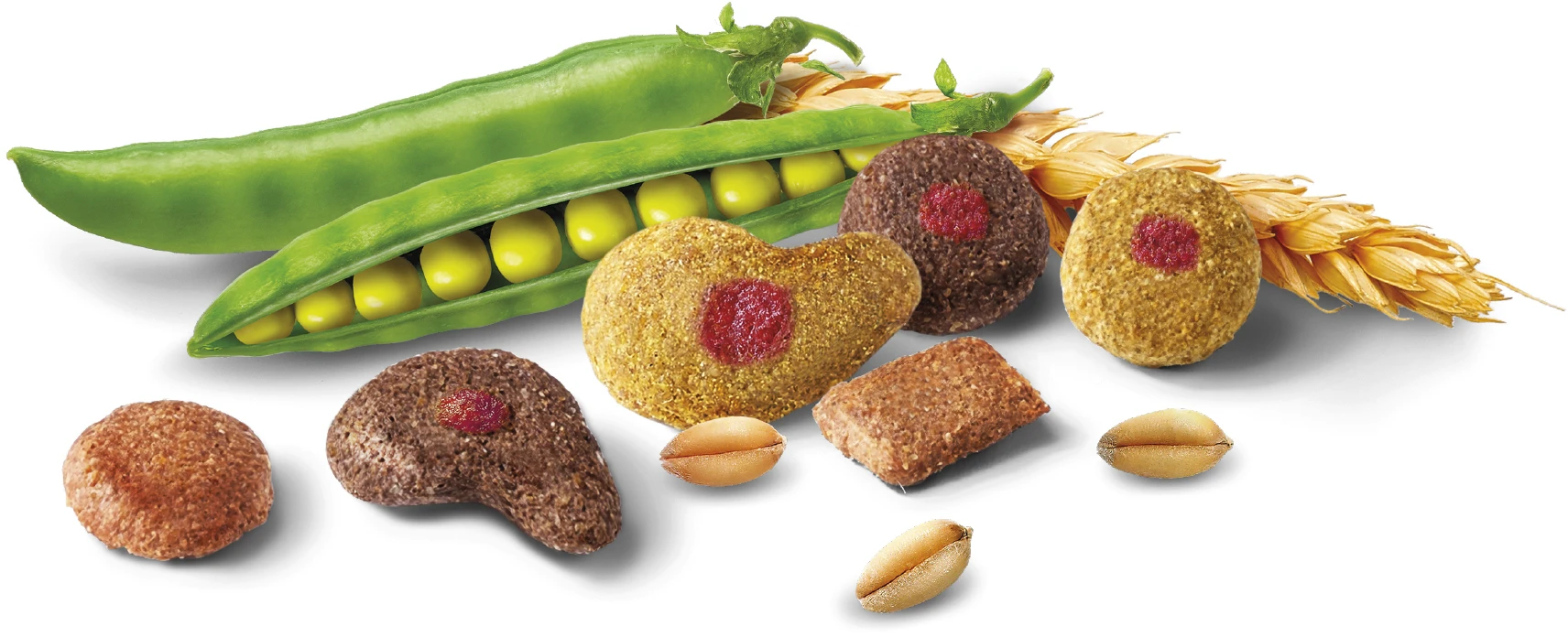 Кальций и витамин D3 для крепких зубов и костей. Состав: Злаки (10% пшеница, 4% кукуруза), мясо и продукты животного происхождения (4% обезвоженные куриные белки, 4% дегидратированного белки индейки, 1% обезвоженной ветчины в начинке), экстракты растительного протеина, продукты овощного происхождения (2.5 % свекольная стружка), масла и жиры, овощи (2% обезвоженного гороха, что эквивалентно 7.7% свежего гороха, 0.05% обезвоженной моркови, что эквивалентно 0.4% свежей моркови), минералы, различные сахара. 67% сухой с начинкой, с 10% начинки с ветчиной.