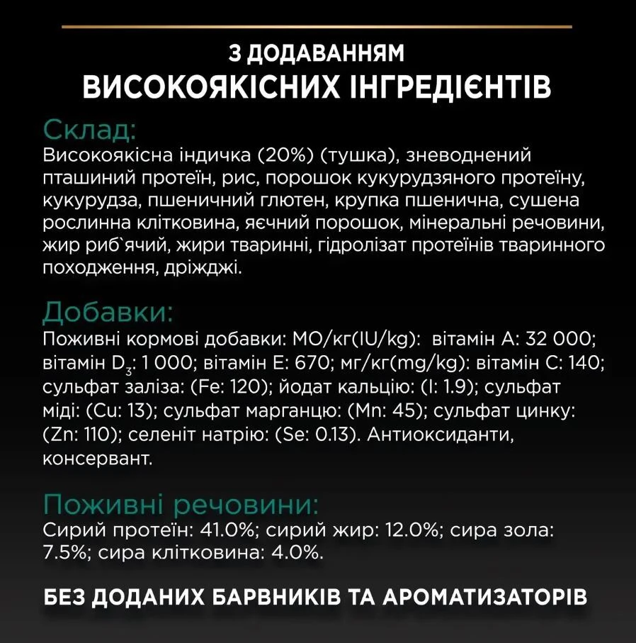 Состав: высококачественная индейка (20%) (тушка), обезвоженный птичий протеин, рис, порошок кукурузного протеина, кукуруза, пшеничный глютен, крупка пшеничная, сушеная растительная клетчатка, яичный порошок, минеральные вещества, жир рыбий животного происхождения, дрожжи.