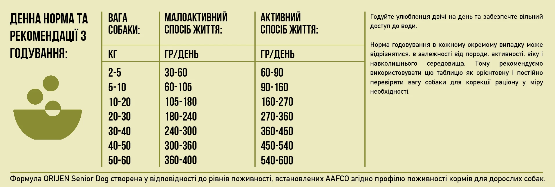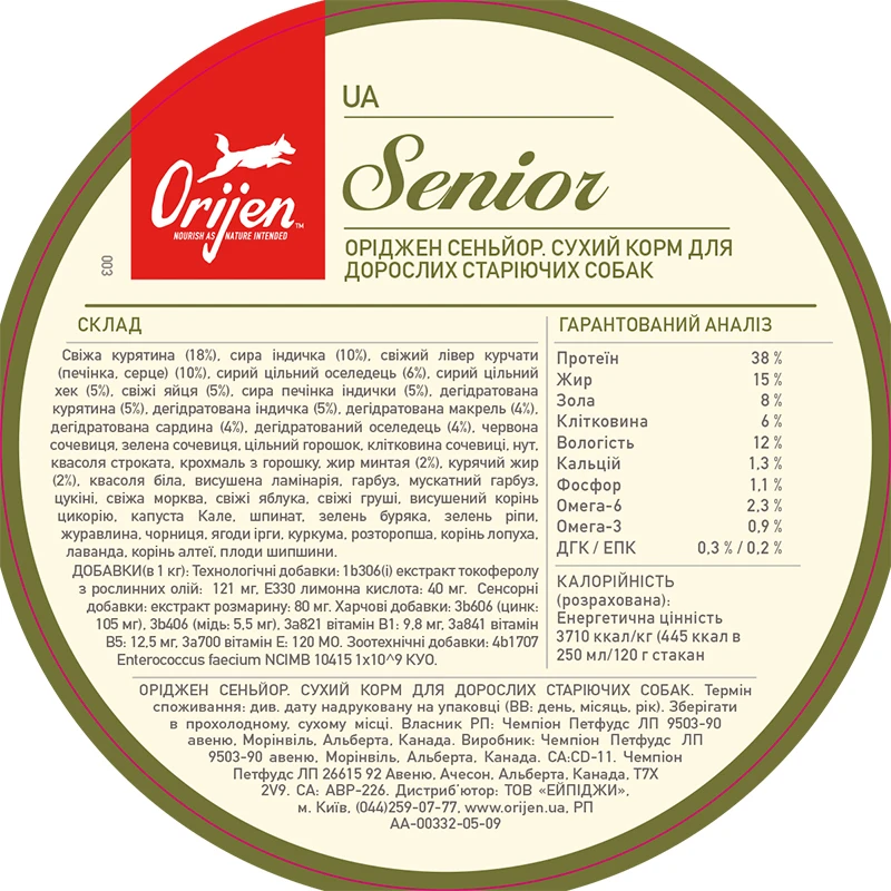 Сухой корм для пожилых собак всех пород Orijen Senior — содержит множество мясных ингредиентов полных протеина (80%), к поеданию которых по своей природе приспособлены все собаки. В его состав входят: мясо выращенных на "свободном выгуле" цыпленка и индейки, цельные яйца и выловленная на воле рыба. Наряду с низким содержанием углеводов и полным отсутствием злаков для воссоздания природного рациона питания вашей собаки в состав корма входят полезные канадские фрукты, овощи и фитокомпоненты (включая морские водоросли, ягоды можжевельника и цветы календулы), которые по природе своей богаты фитонутрицевтиками, витаминами группы В и необходимыми микроэлементами.