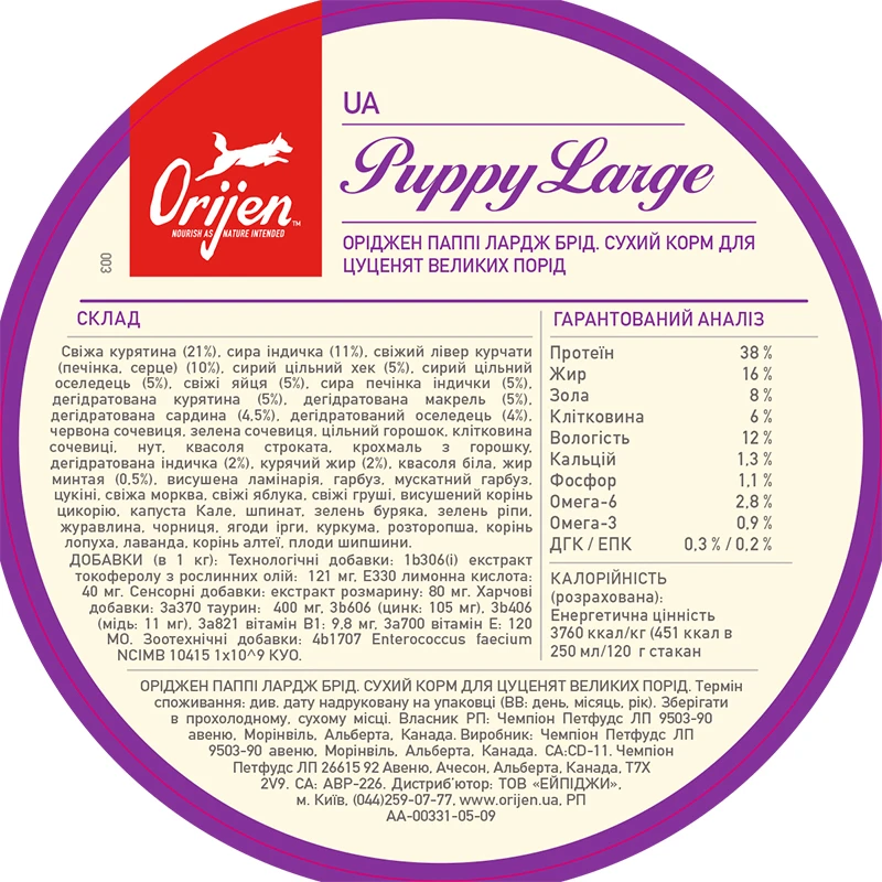 Обменная энергия 3760 ккал/кг (451 ккал в 250 мл/120 г мерного стакана). Где калории распределены следующим образом 40% из протеина, 22% из углеводов и 38% из жира | Рацион ORIJEN Large Breed Puppy создан в соответствии с уровнями питательности, установленными FEDIAF для собак всех стадий жизни, включая щенков больших пород в период роста.
