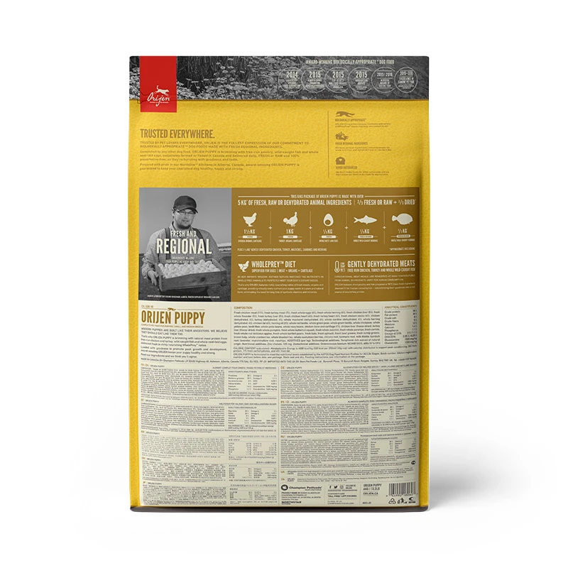 Именно поэтому, отмеченный наградами корм ORIJEN содержит богатое разнообразие свежих мясных ингредиентов в Биологически Соответствующем соотношении WholePrey для отличного питания Вашей собаки в период интенсивного роста и развития.