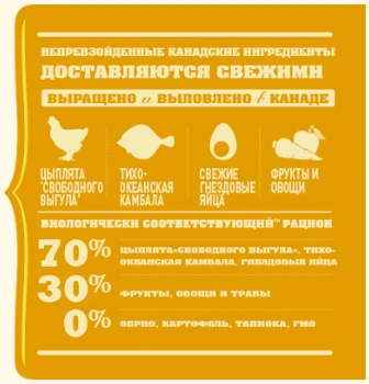 Свежее мясо цыпленка без костей (16%), высушенное мясо цыпленка (13%), высушенное мясо индейки (13%), красная чечевица, зеленый горошек, ливер (печень, сердце, почки) (6%) , куриный жир (6%), свежие цельные яйца (4%), свежее мясо камбалы без костей (4%),высушенное мясо сельди (3%), жир из сельди (3%), вяленая люцерна (2%), зеленая чечевица, фасоль (2%), желтый горошек, клетчатка горошка, свежие куриные хрящи (2%), высушенные водоросли, тыква, мускатная тыква, пастернак, капуста Кале, шпинат, зелень горчицы, зелень репы, морковь , яблоки, груши, лиофилизированная куриная печень, лиофилизированная печень индейки, клюква, черника, корень цикория, куркума, расторопша, корень лопуха, лаванда, корень алтея, плоды шиповника, цинка протеинат 100 мг, сухие продукты ферментации Enterococcus Faecium NCIMB10415.