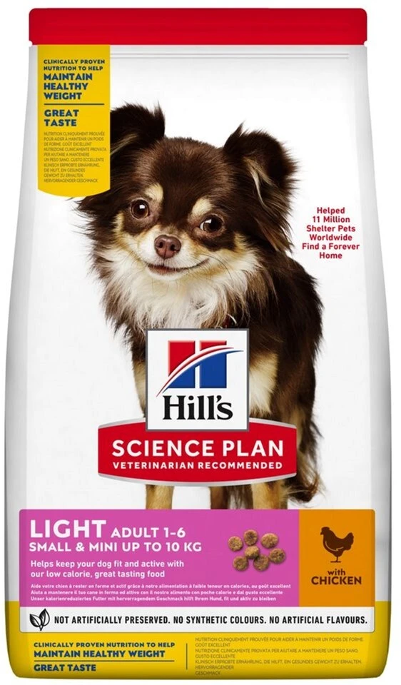 Hill's Science Plan Adult Light Small&Mini - полнорационное питание для взрослых собак в возрасте от 1 до 6 лет и весом до 10 кг, которые подвержены лишнему весу, которым требуется меньше калорий (т.е. собаки, менее активные, стерилизованные/кастрированные или по другим причинам склонны к набору веса).