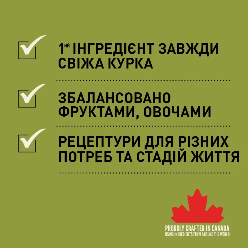 Свежая курица (18%), мука из курицы (18%), красная чечевица, зеленый горошек, свежий ливер цыпленка (печень, сердце) (7%), куриный жир (7%), мука из индейки (4%), яйца (4%), сырая камбала (4%), мука из сельди (4%), рыбий жир (3%), зеленая чечевица, нут, желтый горошек, клетчатка из гороха, крахмал из гороха, сырая печень индейки (1%), соль, высушенная ламинария, тыква, мускатная тыква, свежая морковь, свежие яблоки, свежие груши, свежие цуккини, высушенный корень цикория, капуста кале, шпинат, свежая зелень репы, зелень свеклы, свежие ягоды ирги, куркума, расторопша, корень лопуха, лаванда, корень алтеи, плоды шиповника.