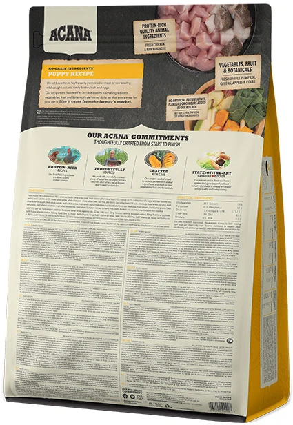 Когда это касается корма ACANA, каждый ингредиент имеет значение. Именно поэтому рецептура ACANA Puppy Recipe создается с заботой и мыслью о растущих щенках всех пород. Рецептура Акана Паппи Ресипе на 70% переполнена качественными мясными ингредиентами, такими как мясо канадских цыплят и сырой камбалы и на 30% сбалансирована фруктами, овощами и травами.