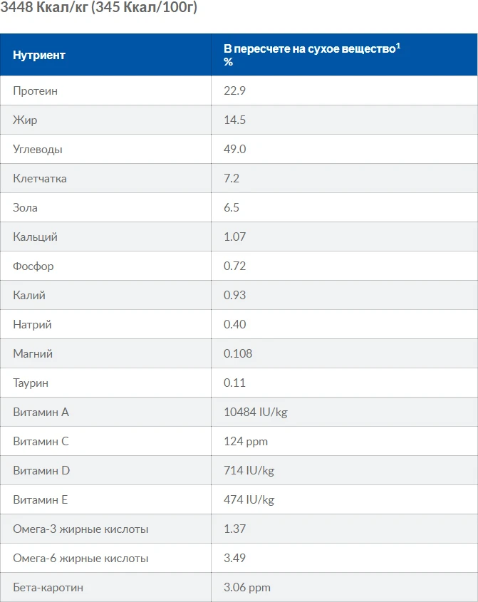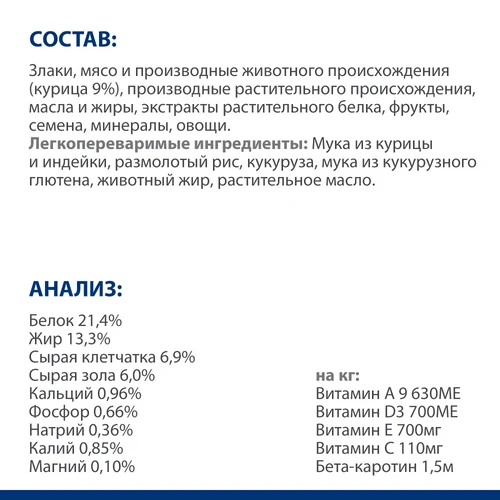 Легкоусваиваемые ингредиенты: мука из курицы и индейки, размолотый рис, кукуруза, мука из кукурузного глютена, животный жир, растительное масло.
