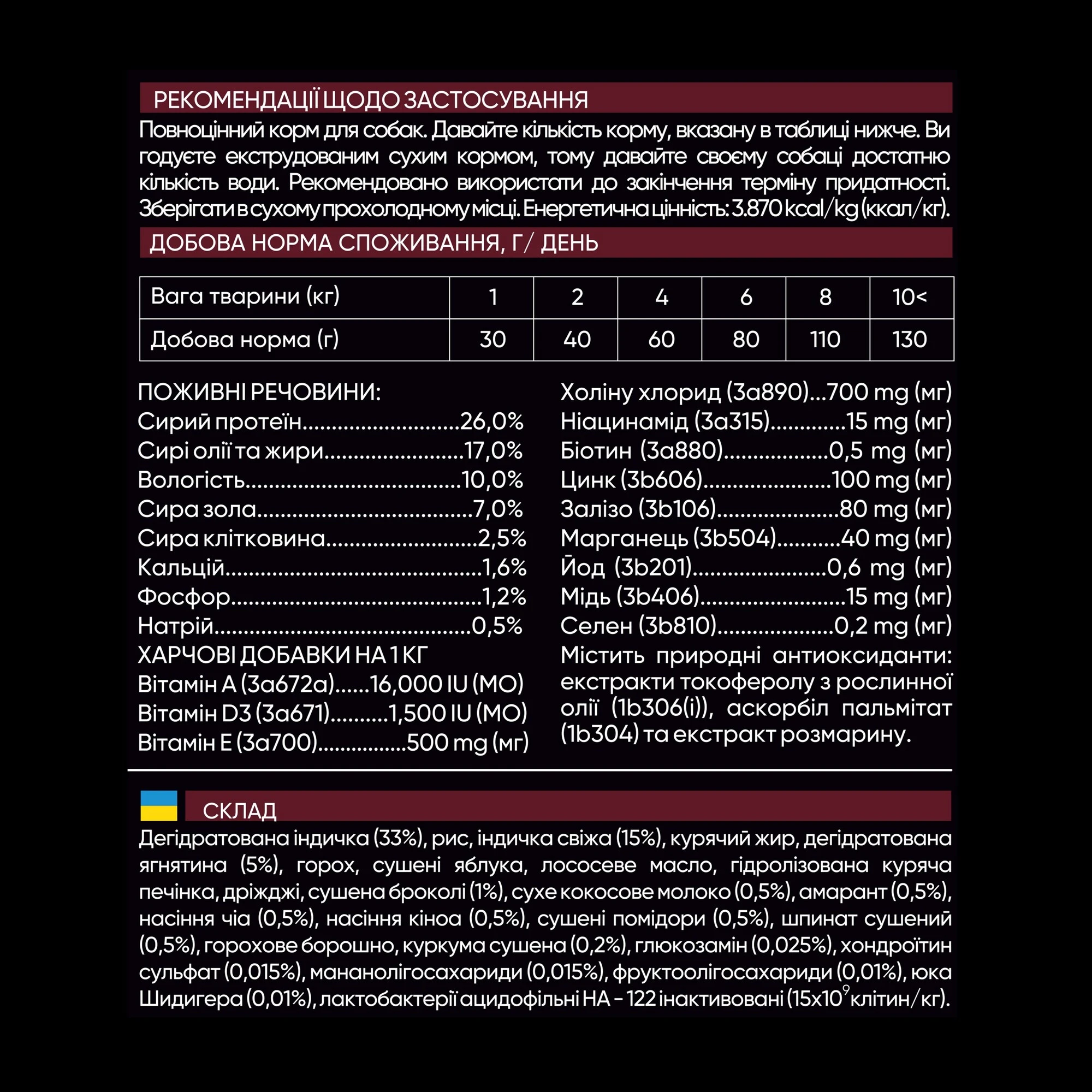 Состав: дегидратированная индейка (33%), рис, свежая индейка (15%), куриный жир, дегиратированный ягненок (5%), горох, сушеные яблоки, лососевое масло, гидролизат куриной печени, сухие дрожжи, брокколи сушеное (1%), кокосовое молоко сухое (0.5%), амарант (0.5%), семена чиа (0.5%), семена квиноа (0.5%), сушеные помидоры (0.5%), сушеный шпинат (0.5%), гороховая мука, сушеная куркума (0.2%), глюкозамин (0.025%), хондроитинсульфат (0.015%), маннанолигосахариды (0.015%), фруктоолигосахариды (0.01%), юкка Шидигера (0.01%), инактивированная Lactobacillus acidophilus HA – 122 (15х109 клеток/кг).
