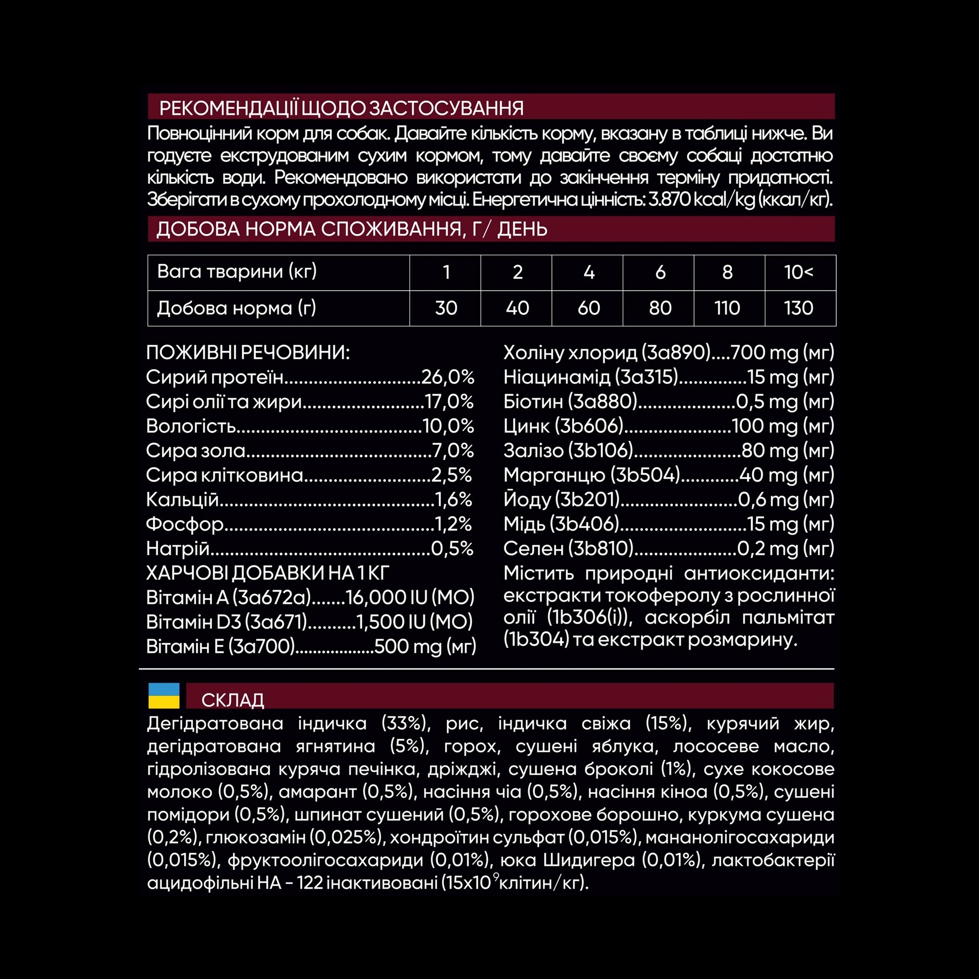 Состав: дегидратированная индейка (33%), рис, свежая индейка (15%), куриный жир, дегиратированный ягненок (5%), горох, сушеные яблоки, лососевое масло, гидролизат куриной печени, сухие дрожжи, брокколи сушеное (1%), кокосовое молоко сухое (0.5%), амарант (0.5%), семена чиа (0.5%), семена квиноа (0.5%), сушеные помидоры (0.5%), сушеный шпинат (0.5%), гороховая мука, сушеная куркума (0.2%), глюкозамин (0.025%), хондроитинсульфат (0.015%), маннанолигосахариды (0.015%), фруктоолигосахариды (0.01%), юкка Шидигера (0.01%), инактивированная Lactobacillus acidophilus HA – 122 (15х109 клеток/кг).