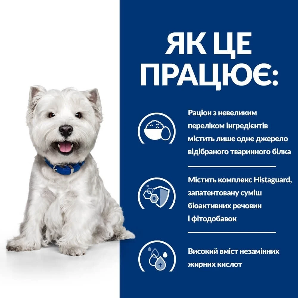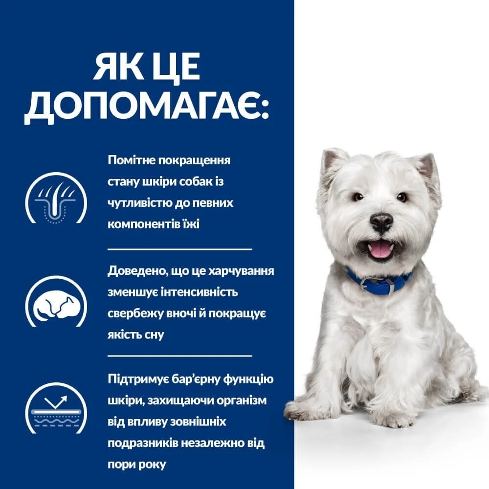 Сухой корм для собак Hill's Prescription Diet Derm Complete Mini – полнорационный диетический корм для собак малых и миниатюрных пород, предназначенный для поддержания функции кожи при дерматозах и чрезмерном выпадении шерсти, а также для уменьшения проявлений непереносимости определенных продуктов и веществ у взрослых собак. Корм отличается высоким содержанием линолевой кислоты, смеси эйкозапентаеновой и докозагексаеновой кислот, а также ограниченным количеством тщательно отобранных источников белка и углеводов.