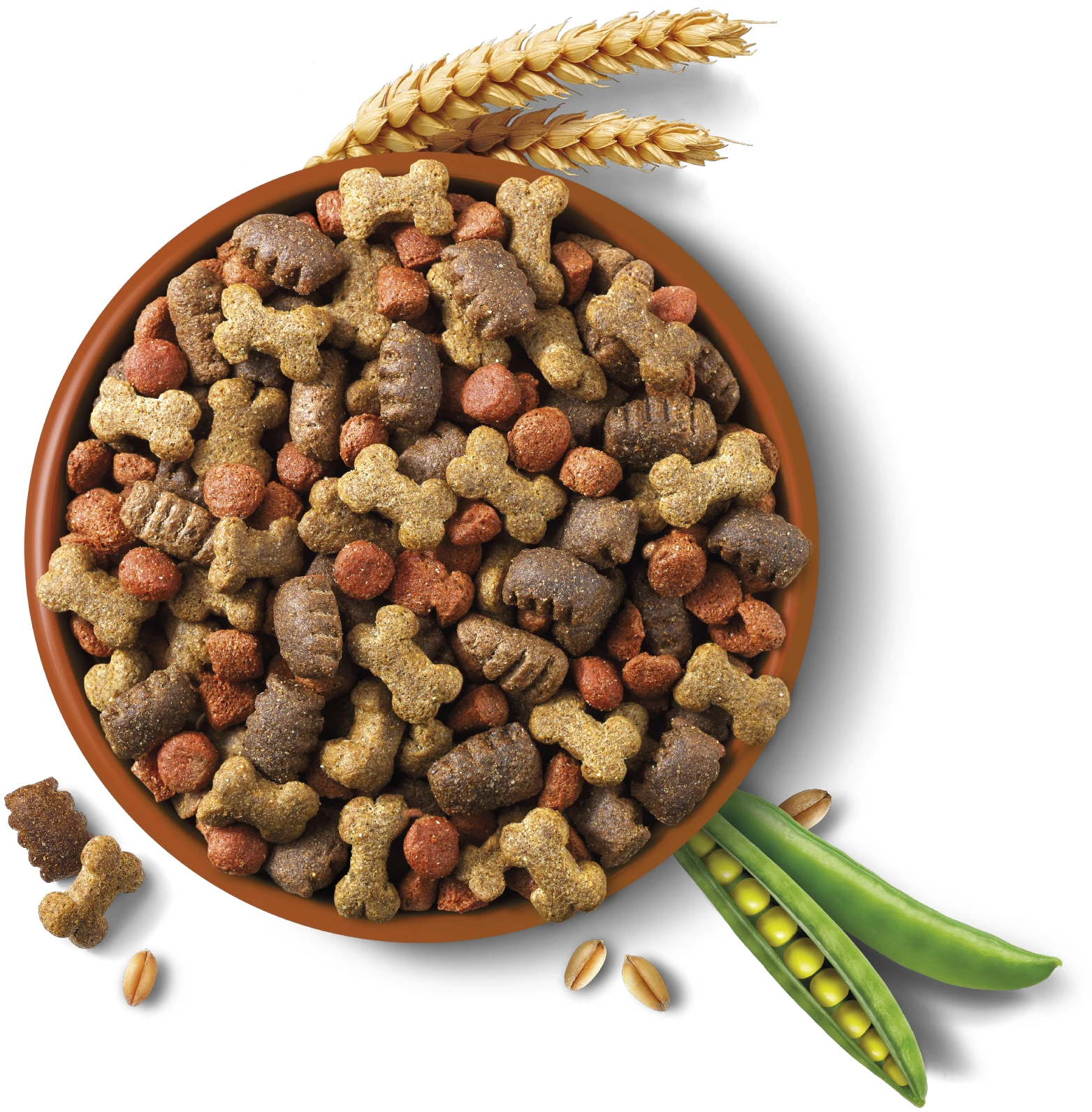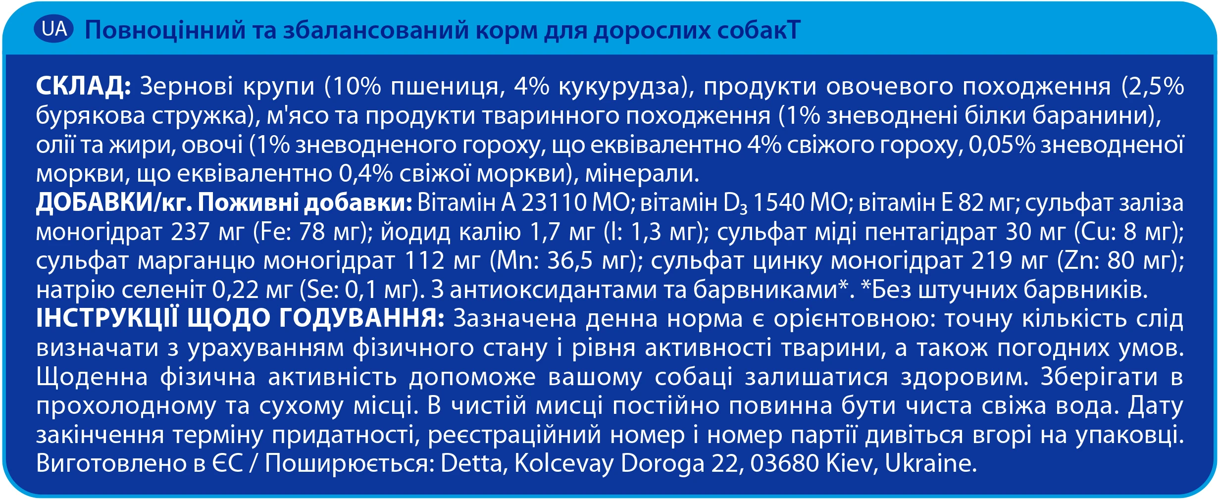Изысканный вкус крокет различной формы с натуральным соком гороха и моркови. Состав: Зерновые крупы (10% пшеница, 4% кукуруза), продукты овощного происхождения (2.5% свекольная стружка), мясо и продукты животного происхождения (1% обезвоженные белки баранины), масла и жиры, овощи (1% обезвоженного гороха, что эквивалентно 4% свежего гороха, 0.05% обезвоженной моркови, что эквивалентно 0.4% свежей моркови), минералы.