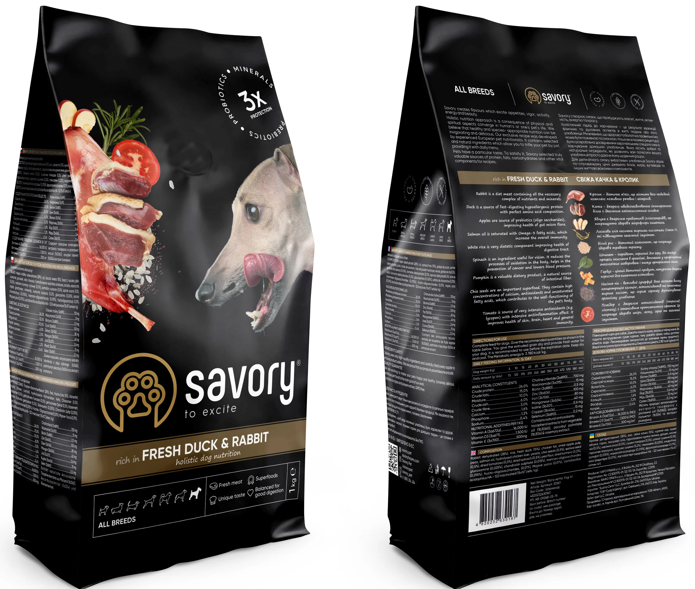 Сухой корм для собак всех пород Savory содержит качественное мясо утки и кролика, суперфуды, яблоки, тыкву и куркуму. Эти компоненты созданы природой для оптимальной кондиции, здоровых суставов и роскошного вида собаки.