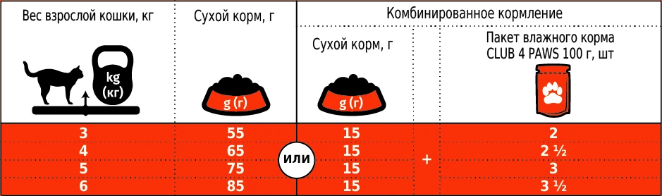 Сухой премиум-рацион Club 4 Paws содержит мясные ингредиенты на первом месте в составе, в том числе 26% из курицы, которые имеют высокий коэффициент перевариваемости – до 80%. Комплекс ненасыщенных жирных кислот Омега 3 + Омега 6 поддерживает кожу здоровой, а шерсть блестящей. Рацион обогащен формулой INTEGRAMIX для общей поддержки здоровья и иммунитета любимца.