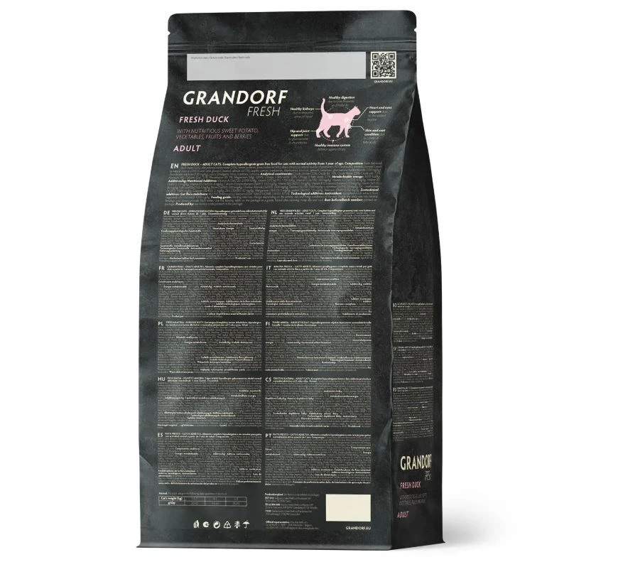 Полнорационный беззерновой корм на основе свежей утки, созданный для взрослых кошек с чувствительной желудочно-кишечной системой и склонностью к пищевой непереносимости. Гипоаллергенная формула без глютена и курятины содержит только хорошо усваиваемые ингредиенты: мясо утки, батат, овощи, пребиотики и живые пробиотики — для поддержания здоровой микрофлоры и комфортного пищеварения. Сбалансированный рацион помогает сохранять жизненную энергию и здоровье кожи и шерсти на высоком уровне.