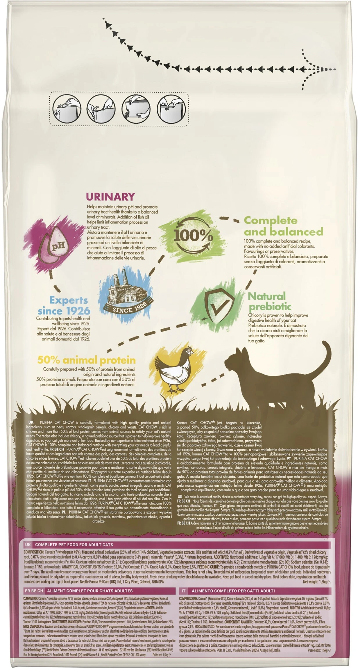 В состав корма для кошек Cat Chow (Кэт Чау) входят белок высокого качества и натуральные ингредиенты: горох, морковь, цельные злаки, цикорий и дрожжи. Cat Chow (Кэт Чау) содержит в составе курятину. 50% белков в составе продукта - животного происхождения, что помогает удовлетворить потребности кошки. Рецептура корма также включает в себя цикорий, который является натуральным источником пребиотика, направленным на улучшение пищеварения, поэтому ваш котик получит максимум пользы из пищи, которую он потребляет.