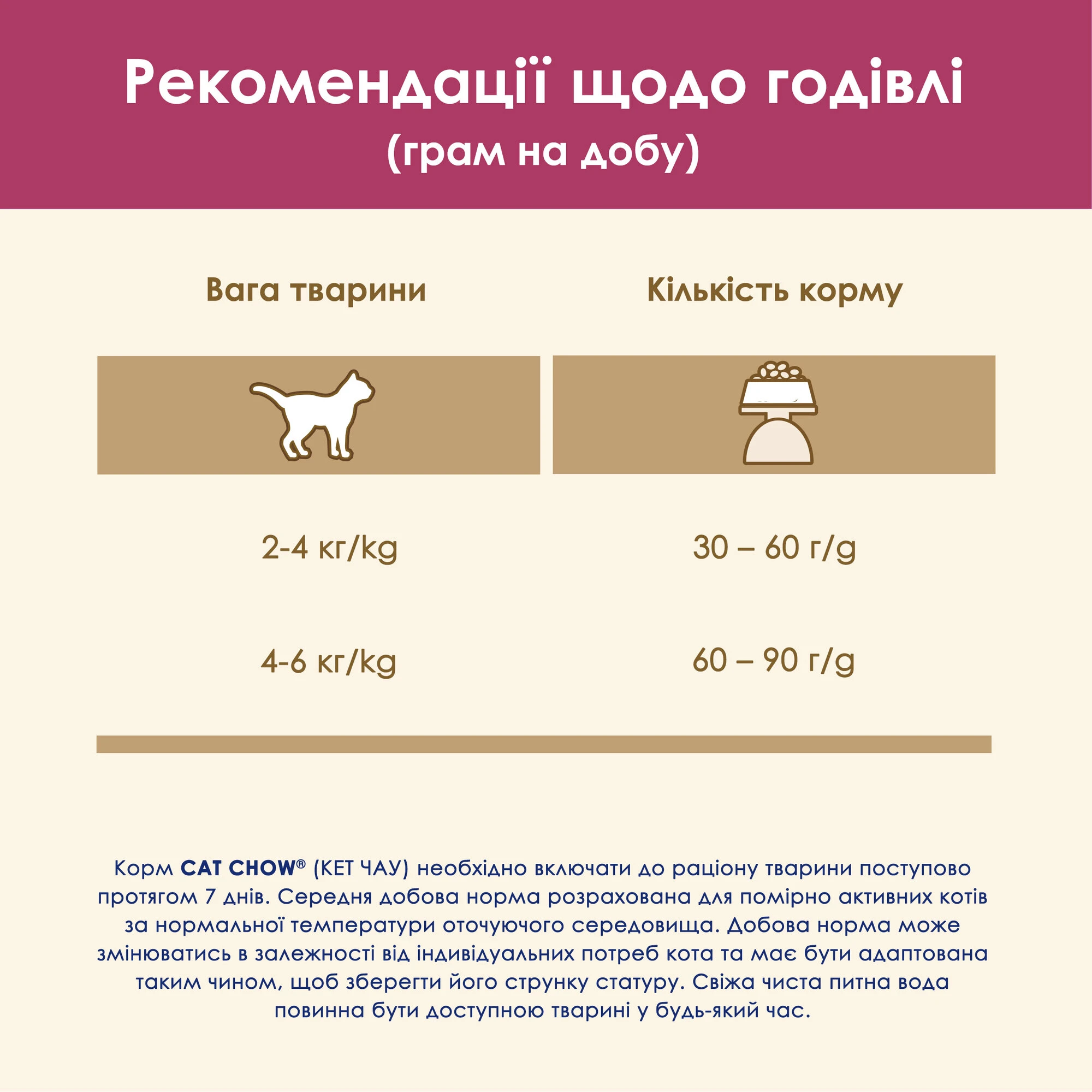 Корм для кошек Cat Chow (Кэт Чау) необходимо включать в рацион животного постепенно в течение 7 дней. Средняя суточная норма рассчитана для умеренно активных кошек при нормальной температуре окружающей среды. Суточная норма может варьироваться в зависимости от индивидуальных потребностей кота и должна быть адаптирована таким образом, чтобы сохранить его стройное телосложение. Свежая чистая питьевая вода должна быть доступна животному в любое время.