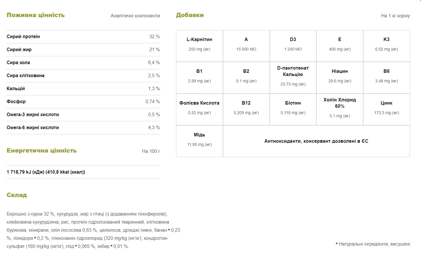 Добавки (на 1 кг корма): L карнитин 250 мг, Витамин А: 15 000 МЕ, Витамин D3: 1 200 МЕ, Витамин Е: 400 мг, Витамин К3: 6.52 мг, Витамин В1: 2.99 мг, Витамин В2: 9.1 мг, D-пантотенат кальция: 23.73 мг, ниацин: 29.6 мг, Витамин В6: 3.48 мг, фолиевая кислота: 0.52 мг, Витамин В12: 0.209 мг, биотин: 0.118 мг, холин хлорид 60 %: 5.1 г, цинк (Е6): 173.3 мг, медь (Е4): 11.95 мг, антиоксиданты, консервант. Натуральные ингредиенты, высушенные.