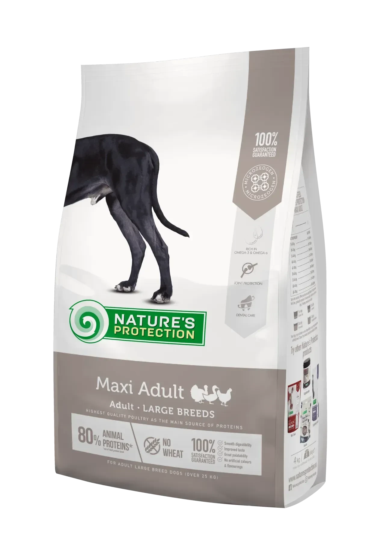 Nature'sProtection LargeBreed Adult – Poultry Trio – сухой супер-премиум корм из 37% мяса курицы, индейки такачки, созданный для взрослых собак больших пород (≥25кг). Сочетание трех видов сочного мяса делает рацион особенно вкусным и обеспечивает полный аминокислотный профиль. Омега-3/6 из семян льна и рыбной муки поддерживают эластичную кожу и блестящую шерсть, а природный минерал MicroZeoGen (клиноптилолит1%) выводит токсины и улучшает усвоение питательных веществ.
