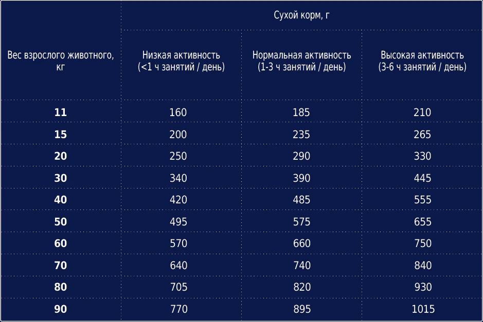 Энергетическая ценность (калорийность) 100 г корма: 1503.81 кДж (359.42 ккал). Хранить в темном месте в закрытой потребительской таре при температуре от +5 °С до +25 °С и относительной влажности не более 75%. Корм необходимо вводить в рацион постепенно (по крайней мере, в течение первых 5-ти дней). Обеспечить животному постоянный доступ к чистой и свежей питьевой воде. Индивидуальные нормы кормления животного могут варьироваться, в зависимости от возраста, породы, уровня активности и окружающей среды.