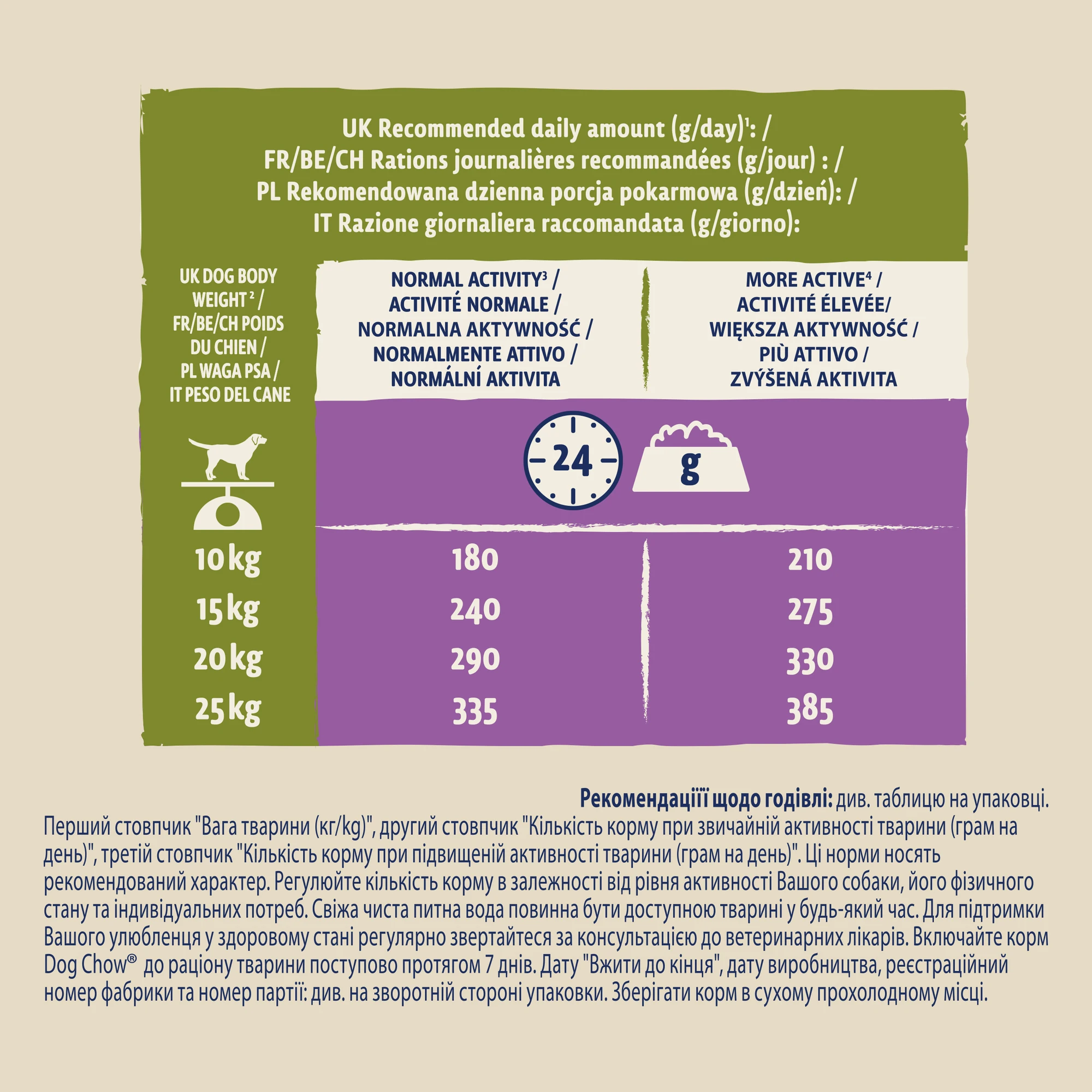 Рекомендации по кормлению: см. таблицы на упаковке. Первый столбец "Вес животного (кг/kg)", второй столбец "Количество корма при обычной активности животного (грамм в день)", третий столбец "Количество корма при повышенной активности животного (грамм в день)". Эти нормы носят рекомендуемый характер. Регулируйте количество корма в зависимости от уровня активности Вашей собаки, ее физического состояния и индивидуальных потребностей. Свежая чистая питьевая вода должна быть доступна животному в любое время. Для поддержания Вашего любимца в здоровом состоянии регулярно обращайтесь за консультацией к ветеринарным врачам. Включайте корм Dog Chow в рацион животного постепенно в течение 7 дней.