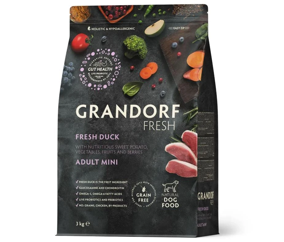 Сухой беззерновой корм Грандорф фреш со свежим мясом утки и бататом — это полнорационное сбалансированное питание холистик-класса для взрослых собак малых пород. Рецептура создана с учетом потребностей животных с чувствительным пищеварением и склонностью к аллергиям. Основу составляет свежее мясо утки — легко усваиваемый белок с высокой питательной ценностью. Батат служит полезным источником энергии и хорошо подходит для ежедневного рациона. Благодаря натуральному составу без зерна, глютена и вредных добавок, корм помогает поддерживать здоровье и активность собак с чувствительным пищеварением.