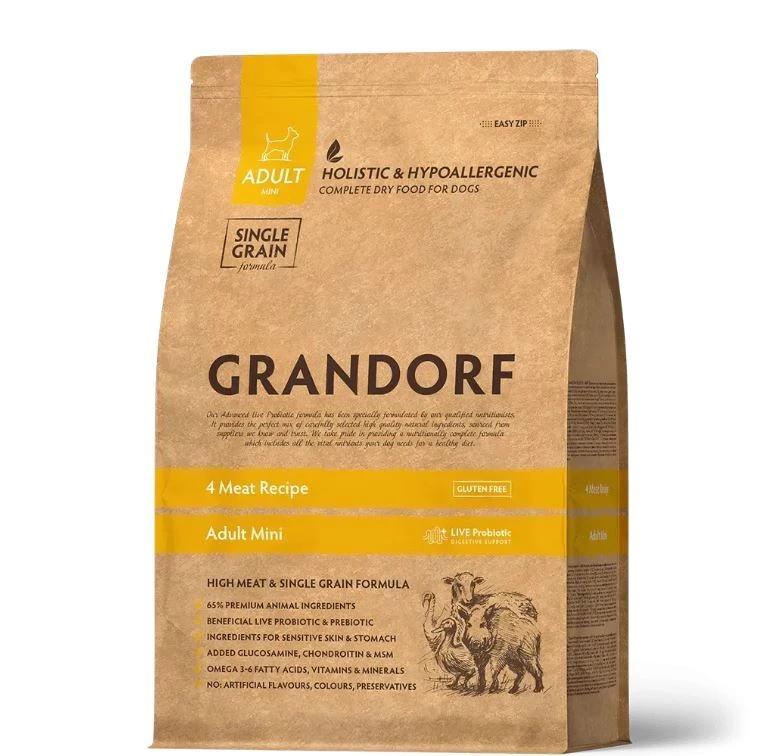 Сухой корм для взрослых собак мини пород Grandorf FOUR MEAT ADULT мини 4 вида мяса и пробиотики, 1 кг