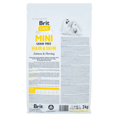 Brit Care Mini Grain Free Hair & Skin — это сухой беззерновой гипоаллергенный корм для взрослых собак миниатюрных пород с длинной, шелковистой шерстью, а также для собак, шерсть которых нуждается в дополнительном уходе.