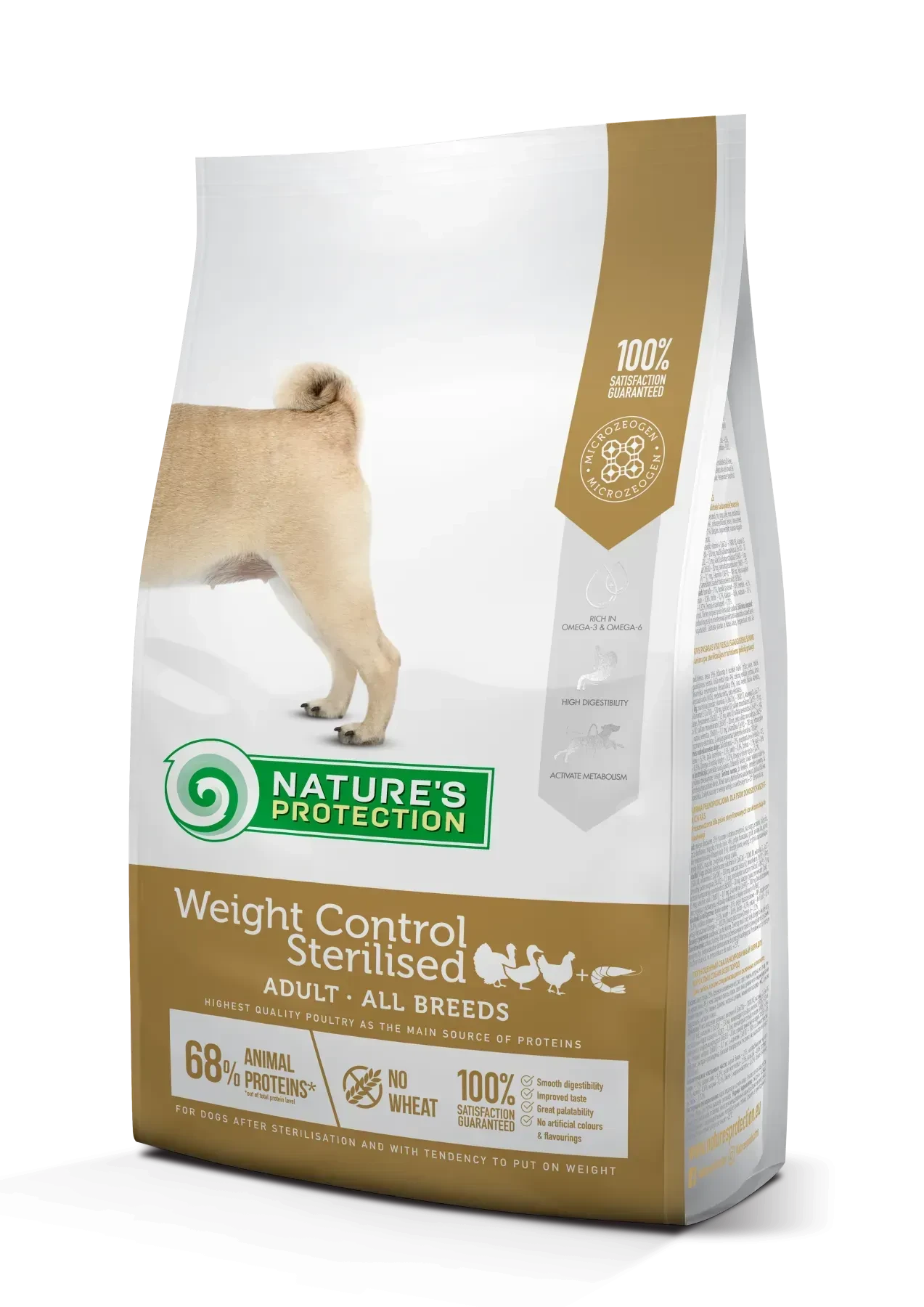 Nature'sProtection WeightControl Sterilised Adult AllBreeds — сухой суперпремиум корм из 35% куриного мяса, созданный для взрослых собак всех пород после стерилизации или кастрации и для животных, склонных к набору веса. Курятина без субпродуктов дарит насыщенный вкус и легкоусвояемый белок, а муку из криля и семян льна обеспечивают Омега-3/6, поддерживающие здоровье кожи, шерсти и сердца. Формула с пониженным содержанием жира (10%) дополнена L‑карнитином (100 мг/кг) для эффективного сжигания калорий, а природный минерал MicroZeoGen очищает организм от токсинов и усиливает усвоение питательных веществ.