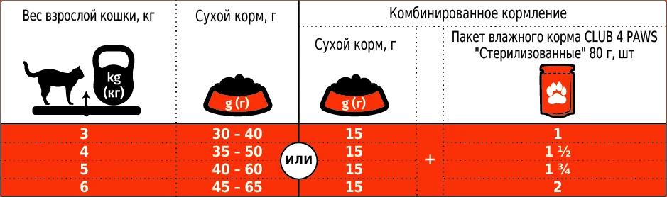 Специальный комплекс Club 4 Paws для кастрированных котов и стерилизованных кошек. Сухой премиум-рацион разработан с учетом потребностей организма животного после стерилизации или кастрации. Он содержит мясные ингредиенты на первом месте в составе, из них 24% курицы, которая имеет высокий коэффициент переваримости. Сбалансированное соотношение белков и жиров (32/15), а также сниженная калорийность рациона способствуют поддержанию оптимального веса кота или кошки. DL-метионин – незаменимая аминокислота, регулирующая обмен веществ, обеспечивает здоровье почек и способствует восстановлению клеток печени. Специальный баланс Са, P и Mg обеспечивает профилактику мочекаменной болезни из-за снижения кристаллов солей в моче.