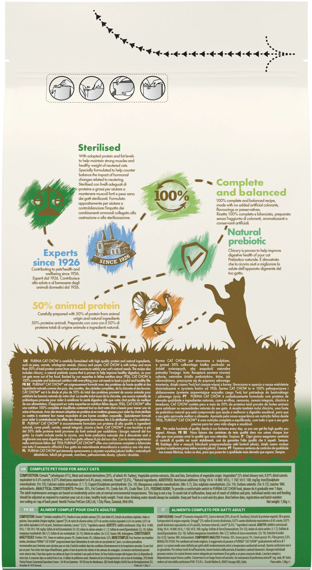 Сухой корм Cat Chow Sterilised (Кэт Чау Стерилайзд) с индейкой - это полнорационное питание для взрослых стерилизованных кошек / кастрированных котов.