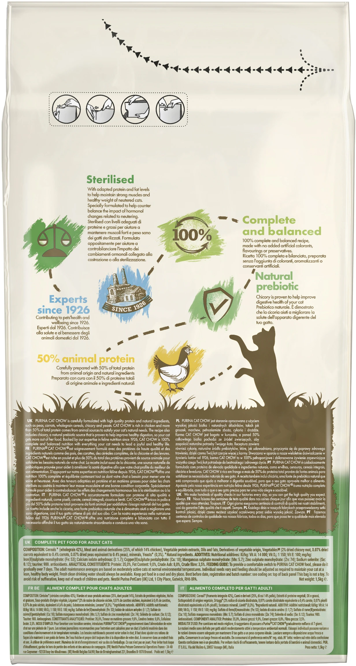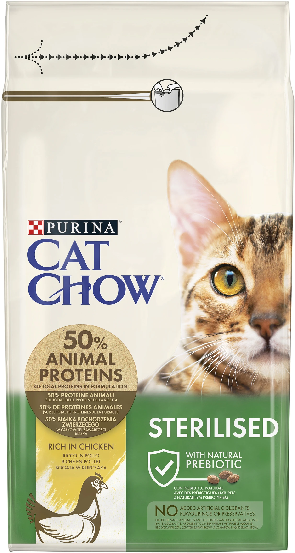 Сухой корм Cat Chow Sterilised (Кэт Чау Стерилайзд) с курицей - это полнорационное питание для взрослых стерилизованных кошек / кастрированных котов.
