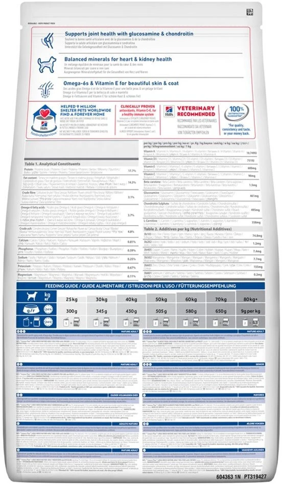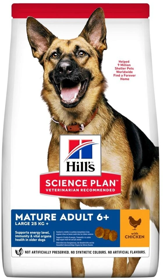 Сухой корм для собак Hill's Science Plan Mature Adult 6+ Large Breed, с курицей – специально разработанный для удовлетворения особых потребностей зрелых собак крупных и гигантских пород. В состав корма введены активные ингредиенты глюкозамин и хондроитин — вещества для защиты здоровья суставов собак и сохранения их подвижности на более длительное время. Кроме того, корм имеет оптимальный минеральный состав, который позволит поддержать жизненно важные органы. сердце и почки. Также в состав входит L-карнитин, помогающий превращать жиры в энергию и, таким образом, вместе с высококачественным белком курицы способствует поддержанию мышечной массы собаки в норме. В дополнение, корм обогащен омега-3 и омега-6 жирными кислотами, которые положительно влияют на состояние кожи и шерсти. для взрослых собак в возрасте от 6 лет и весом более 25 кг, что обеспечивает легкую усвояемость за счет синергической смеси ингредиентов, поддерживающих надлежащий уровень энергии и активности.