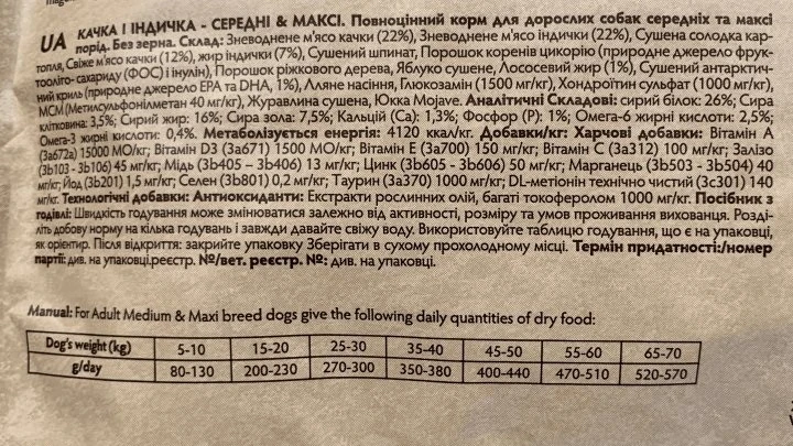 Дегидрированное мясо утки, дегидрированное мясо индейки, Сушеный сладкий картофель (батат), Свежее мясо утки, Жир индейки, Сушеный шпинат, Экстракт цикория (природный источник FOS и инулина), Мука из плода рожкового дерева, Сушеный Антарктический Криль (природный источник EPA и DHA), Семена льна, DL-метионин, Глюкозамин, Хондроитин, МСМ (Метилсульфонилметан), Комплекс натуральных антиоксидантов (Экстракт розмарина, грейпфрута, Апельсина, куркума и Сизи). Сохранен витамином С, розмарином и смесью природных токоферолов (источник натурального витамина Е).