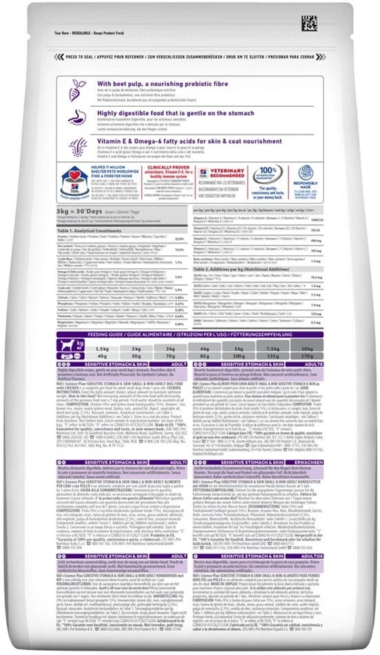Рекомендации по кормлению: Сухой корм Hill's Science Plan Sensitive Stomach&am Skin Small&MIni рекомендован для здорового пищеварения и сохранения красоты шерсти у взрослых собак малых и миниатюрных пород пород в возрасте до 6 лет. В течение беременности или лактации собак малых и миниатюрных пород рекомендовано кормить кормом для щенков Hill's Science Plan Puppy Small&Mini.
