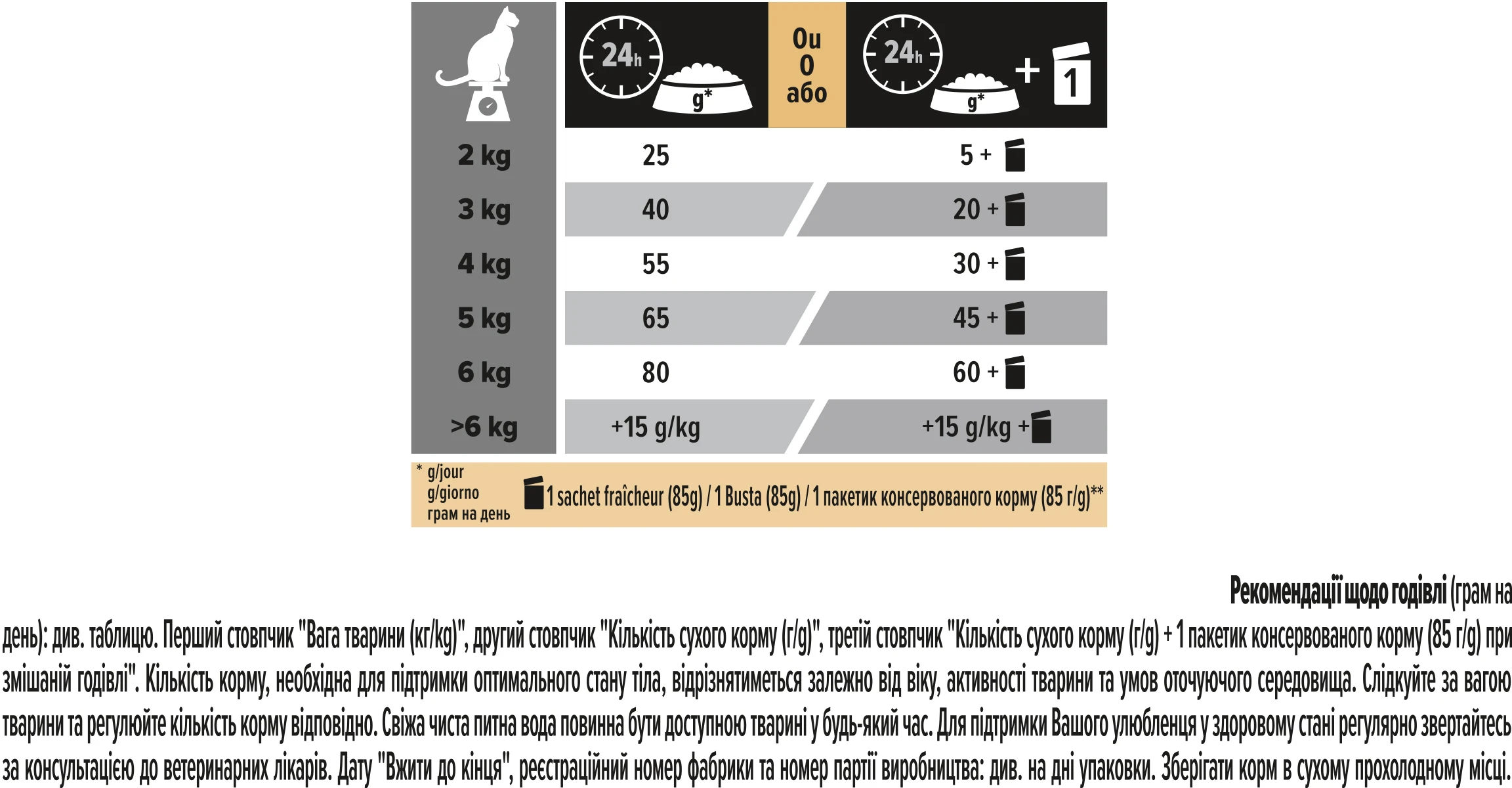 Рекомендации по кормления (грамм в день): см. таблицу. Первый столбик "Вес животного (кг/kg), второй столбик "Количество сухого корма (г/g)", третий столбик "Количество сухого корма (г/g) + 1 пакетик консервированного корма (85 г/g) при смешанном кормлении" Количество корма, необходимое для поддержания оптимального состояния тела, будет отличаться в зависимости от возраста, активности животного и условий окружающей среды Следите за весом животного и регулируйте количество корма соответственно. любимца в здоровом состоянии регулярно обращайтесь за консультацией к ветеринарным врачам.