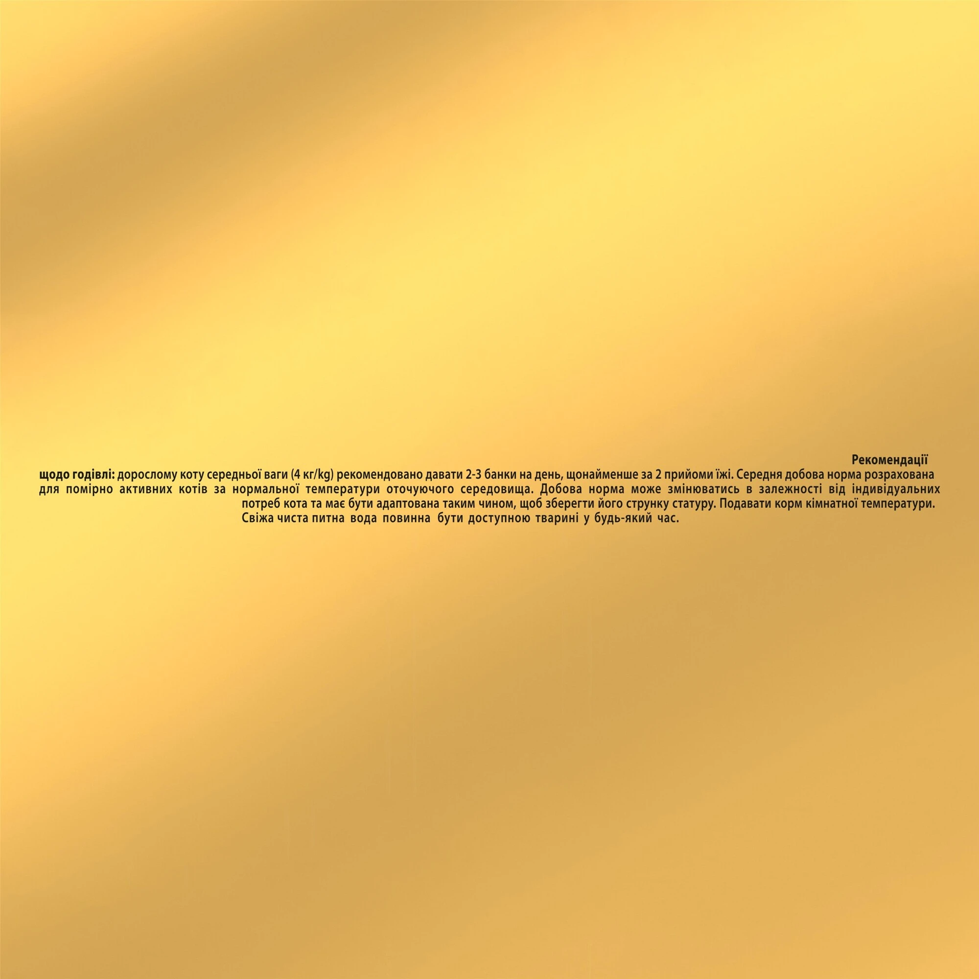 Для кота весом в 4 кг – скармливайте 2-3 баночки в день по меньшей мере за 2 отдельных кормления. Средняя суточная норма рассчитана для умеренно активных кошек при температуре окружающей среды. Суточная норма может изменяться в зависимости от индивидуальных потребностей кота и должна быть приспособлена, чтобы сохранить его стройное телосложение. Свежая чистая питьевая вода должна быть доступна животному в любое время.