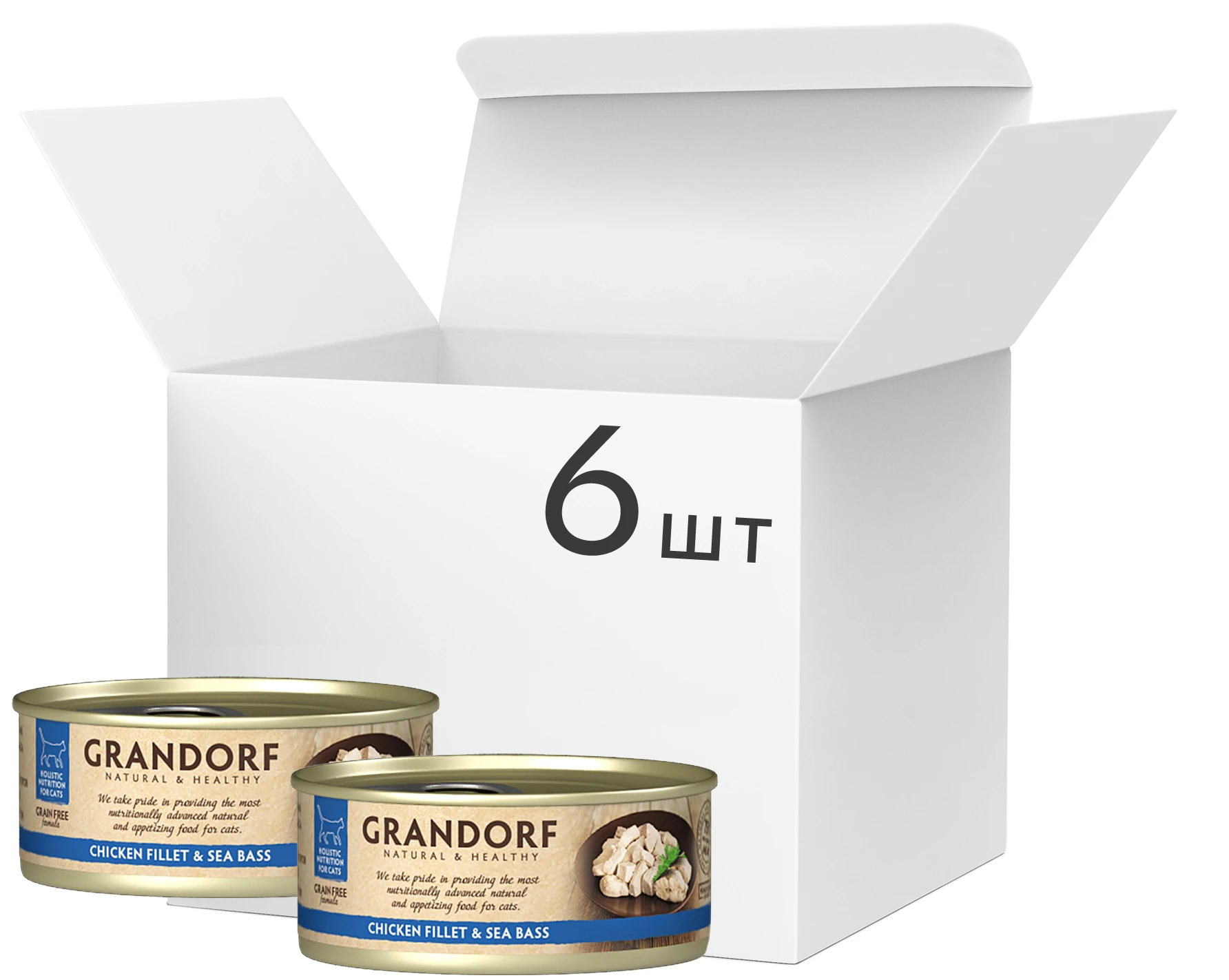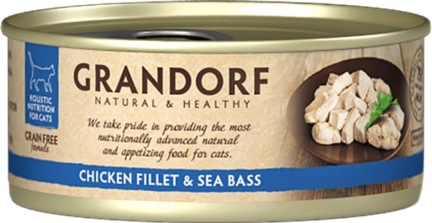 Состав: 50% куриная грудка, 25% филе сибаса, 25% собственный сок, 0% зерновых