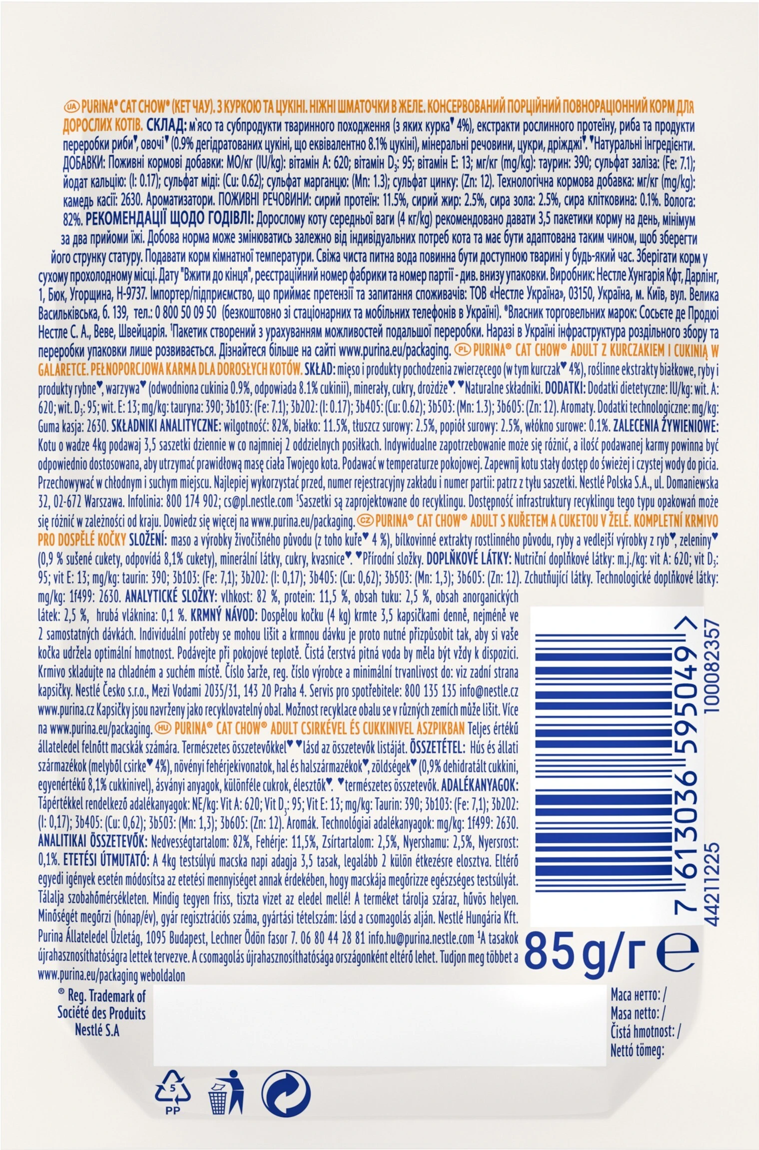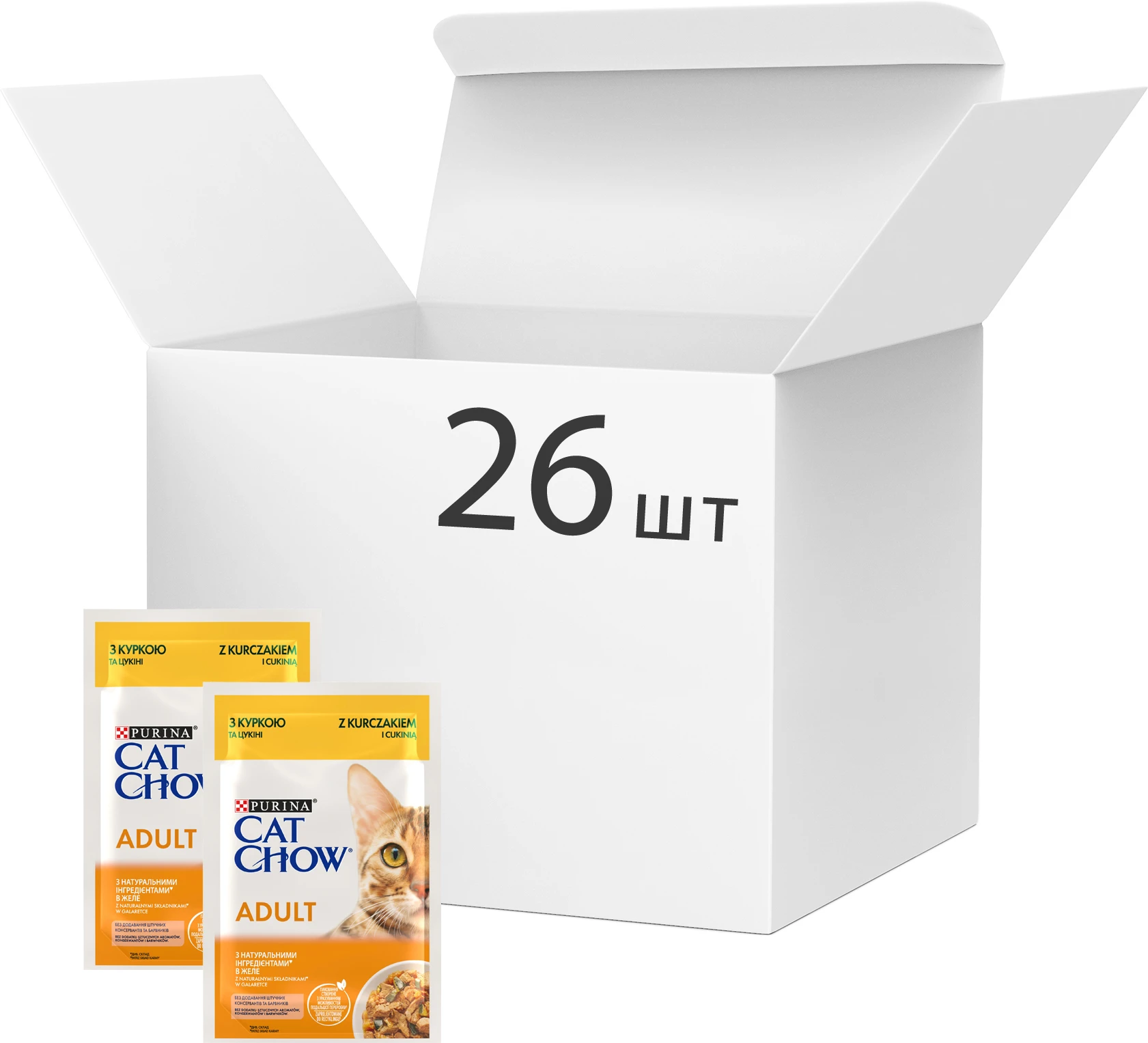Purina CAT CHOW (Кэт Чау). С курицей и цуккини. Нежные кусочки в желе. Консервированный порционный полнорационный корм для взрослых кошек.