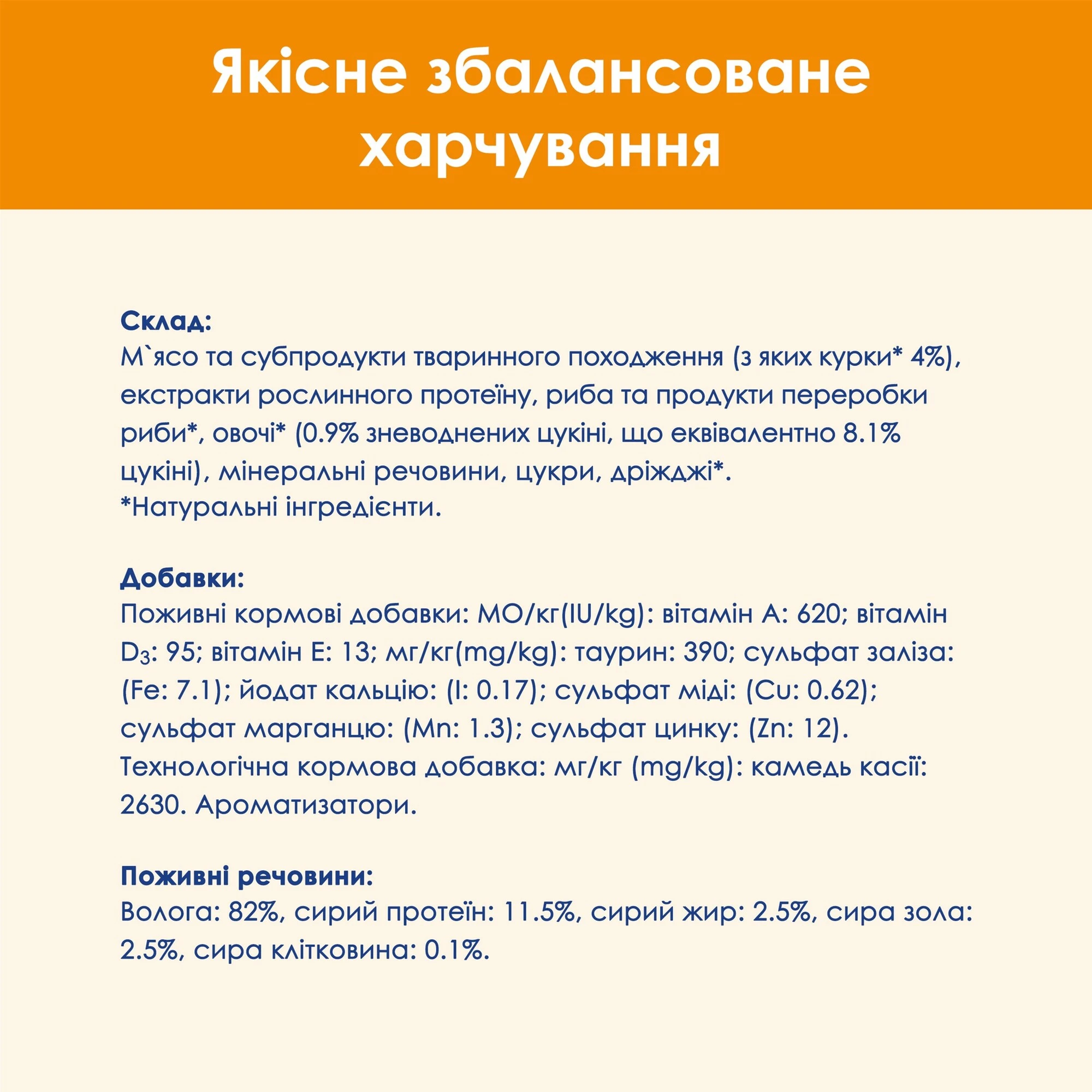 Состав: мясо и субпродукты животного происхождения (из которых курицы* 4%), экстракты растительного протеина, рыба и продукты переработки рыбы*, овощи* (0.9% обезвоженных цуккини, что эквивалентно 8.1% цуккини), минеральные вещества, сахара, дрожжи*.