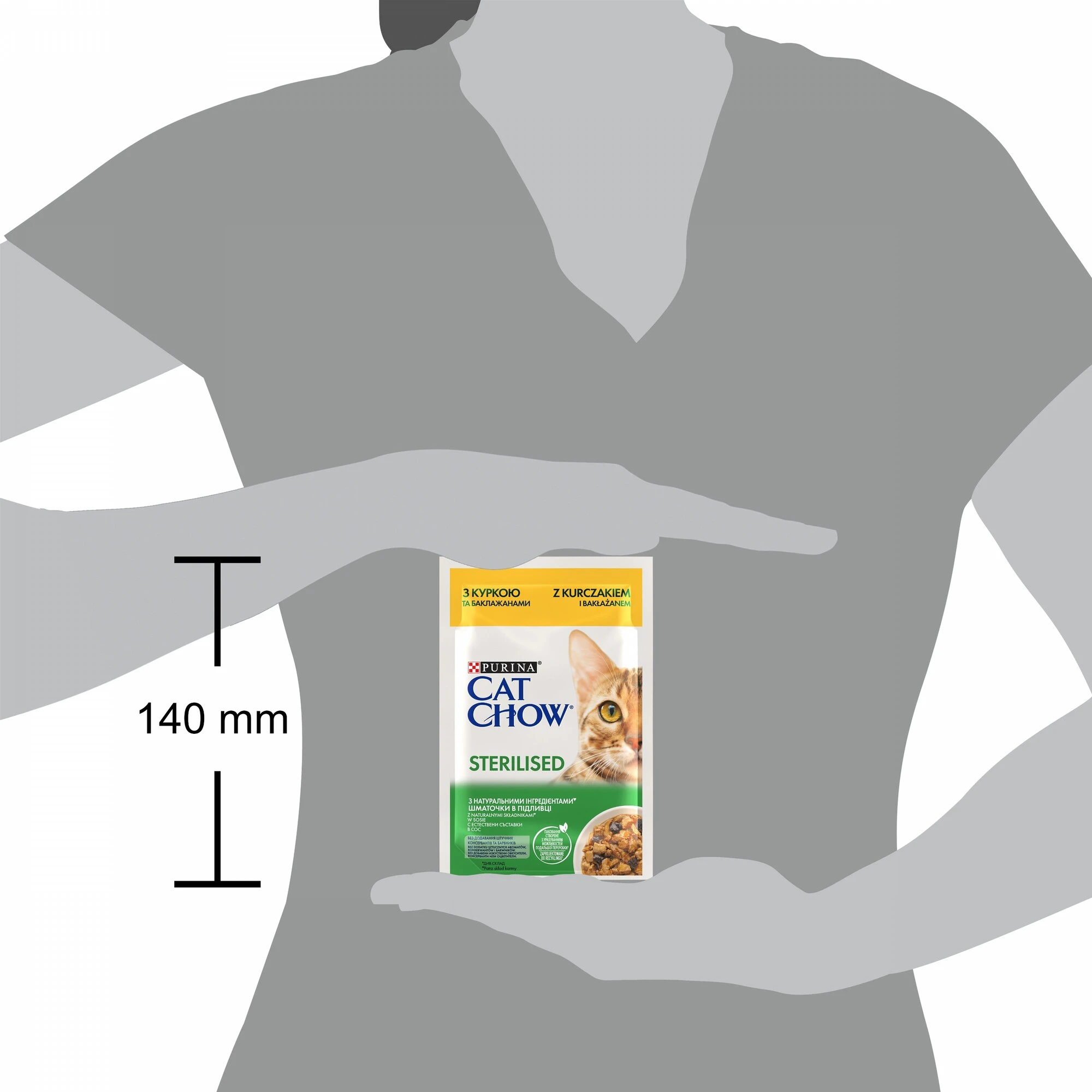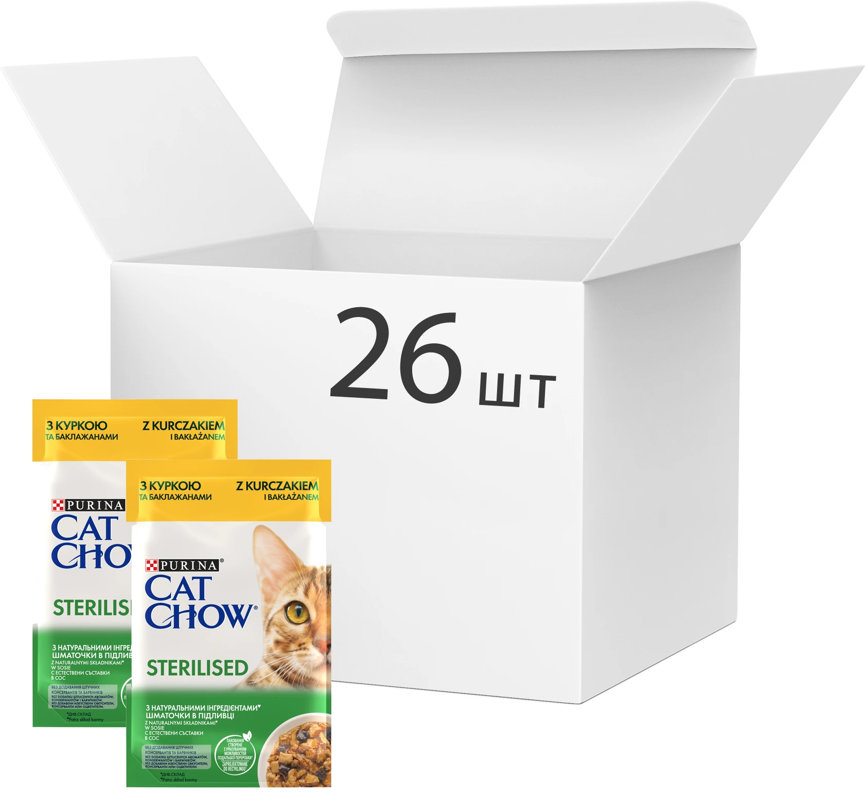 Purina CAT CHOW (Кэт Чау). С курицей и баклажанами. Кусочки в соусе. Консервированный порционный полнорационный корм для взрослых стерилизованных кошек/ кастрированных кошек.