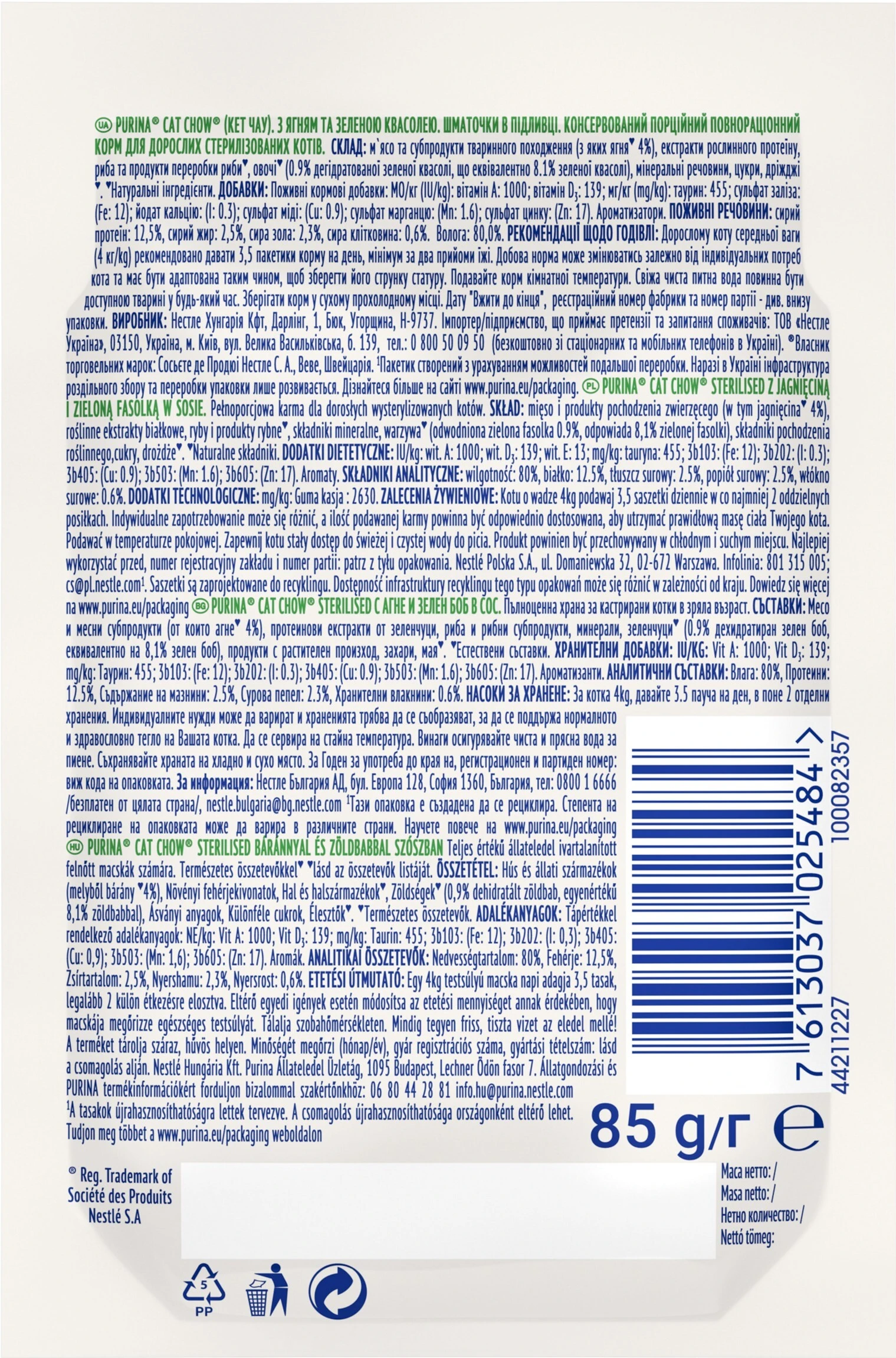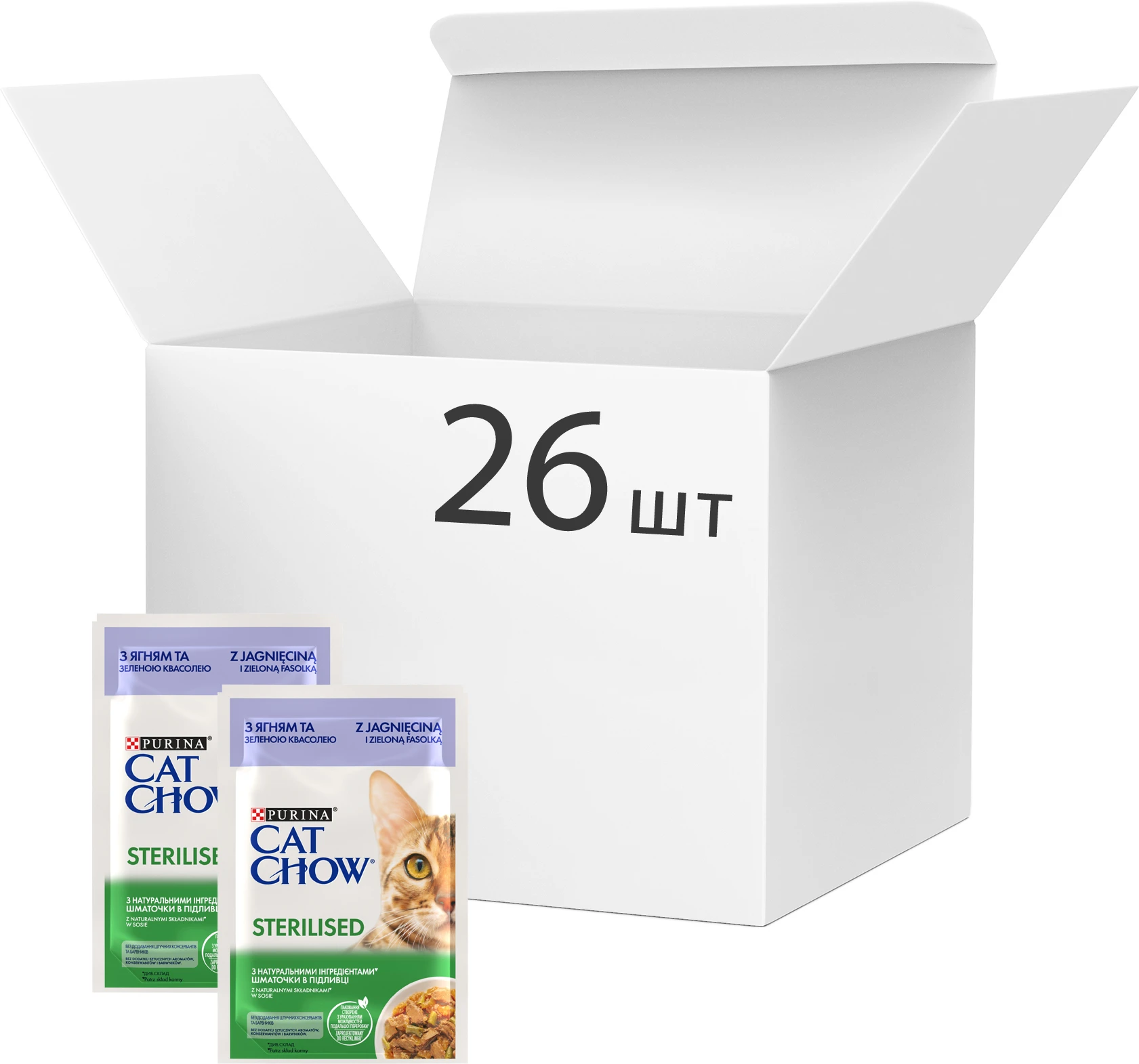 Purina CAT CHOW (Кэт Чау). С ягненком и зеленой фасолью. Кусочки в соусе. Консервированный порционный полнорационный корм для взрослых стерилизованных кошек/кастрированных кошек.