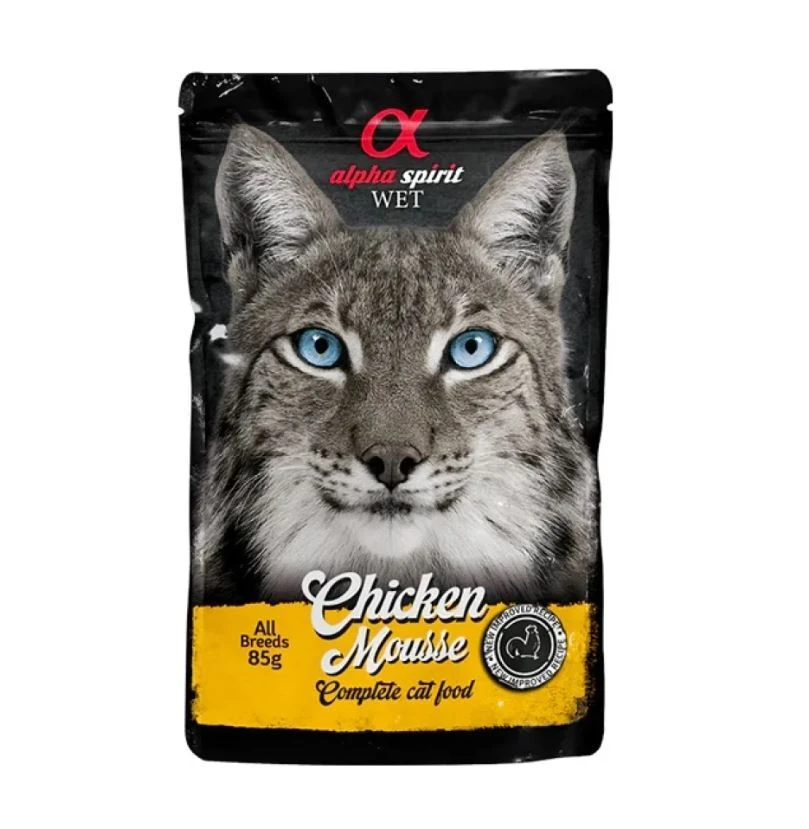 Полнорационный влажный корм для взрослых кошек Альфа Спирит Чикен Мусс Кетc готовится из натуральных ингредиентов. Особенностью этой рецептуры является то, что в ее состав входит единственный источник мясных протеинов – 95% курятины, без зерновых. Это идеальный рацион для кошек с чувствительным пищеварением.