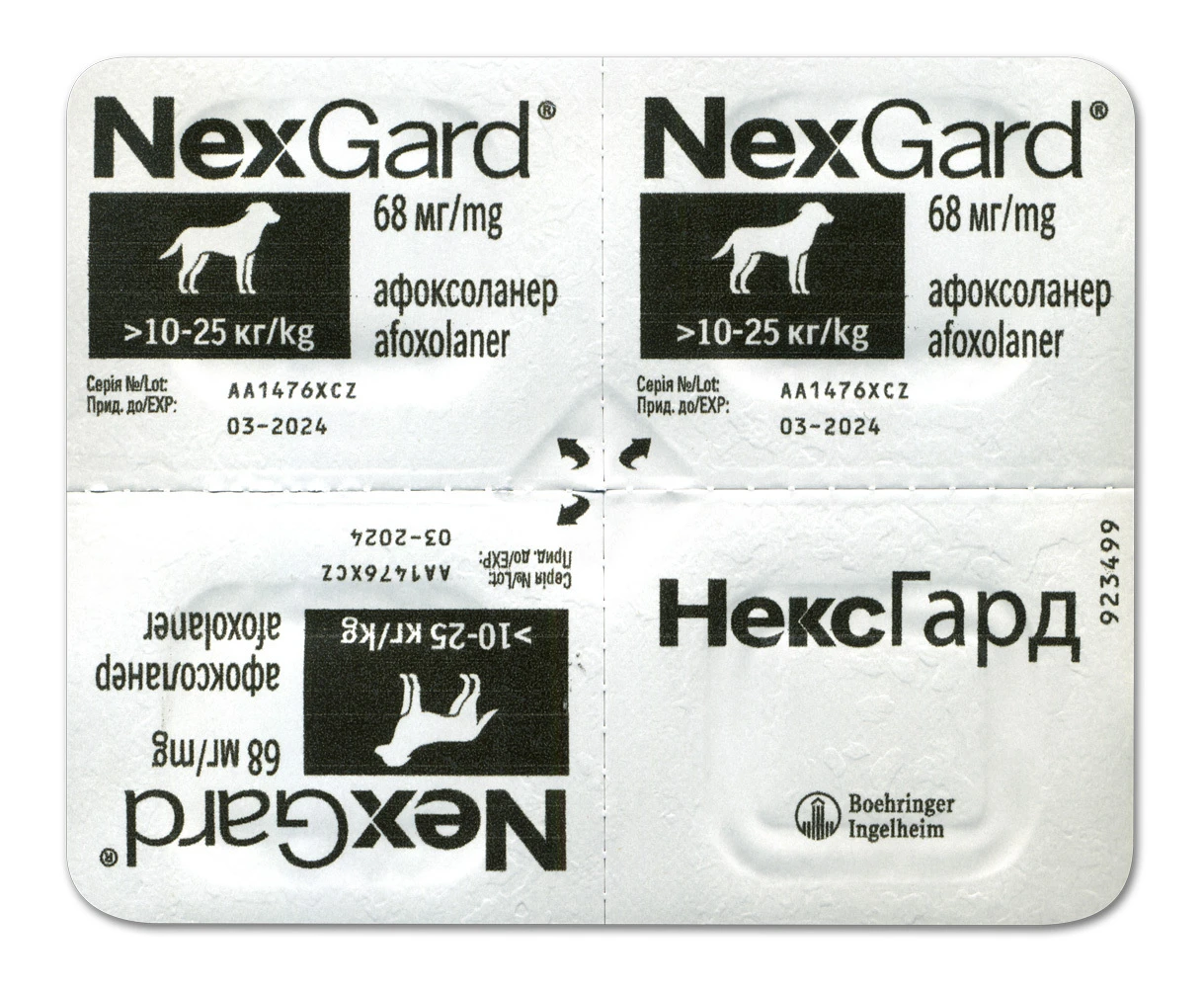 NexGard (НексГард) новый препарат для борьбы с эктопаразитами собак, дозировка L — для собак весом от 10 до 25 кг.