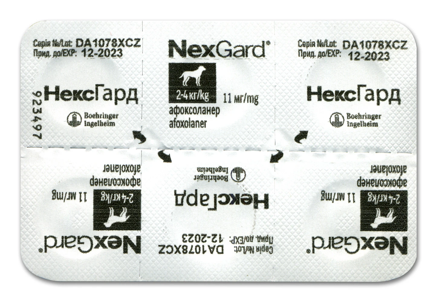 NexGard (НексГард) новый препарат для борьбы с эктопаразитами собак, дозировка S — для собак весом от 2 до 4 кг.