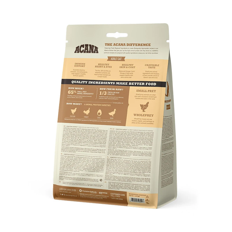 Годуйте вашого мініатюрного дикого кота раціоном, переповненим якісними м'ясними інгредієнтами. Новий раціон ACANA Homestead Harvest переповнений м'ясом курчат, індички та качки, вирощених на вільному вигулі. Усі м'ясні інгредієнти представлені в співвідношенні WholePrey, включаючи м'ясо птиці, органи та хрящі, забезпечуючи природне харчування вашого кота та смак, перед яким він не зможе встояти, щоб ваш улюбленець завжди залишався здоровим, щасливим і сильним.