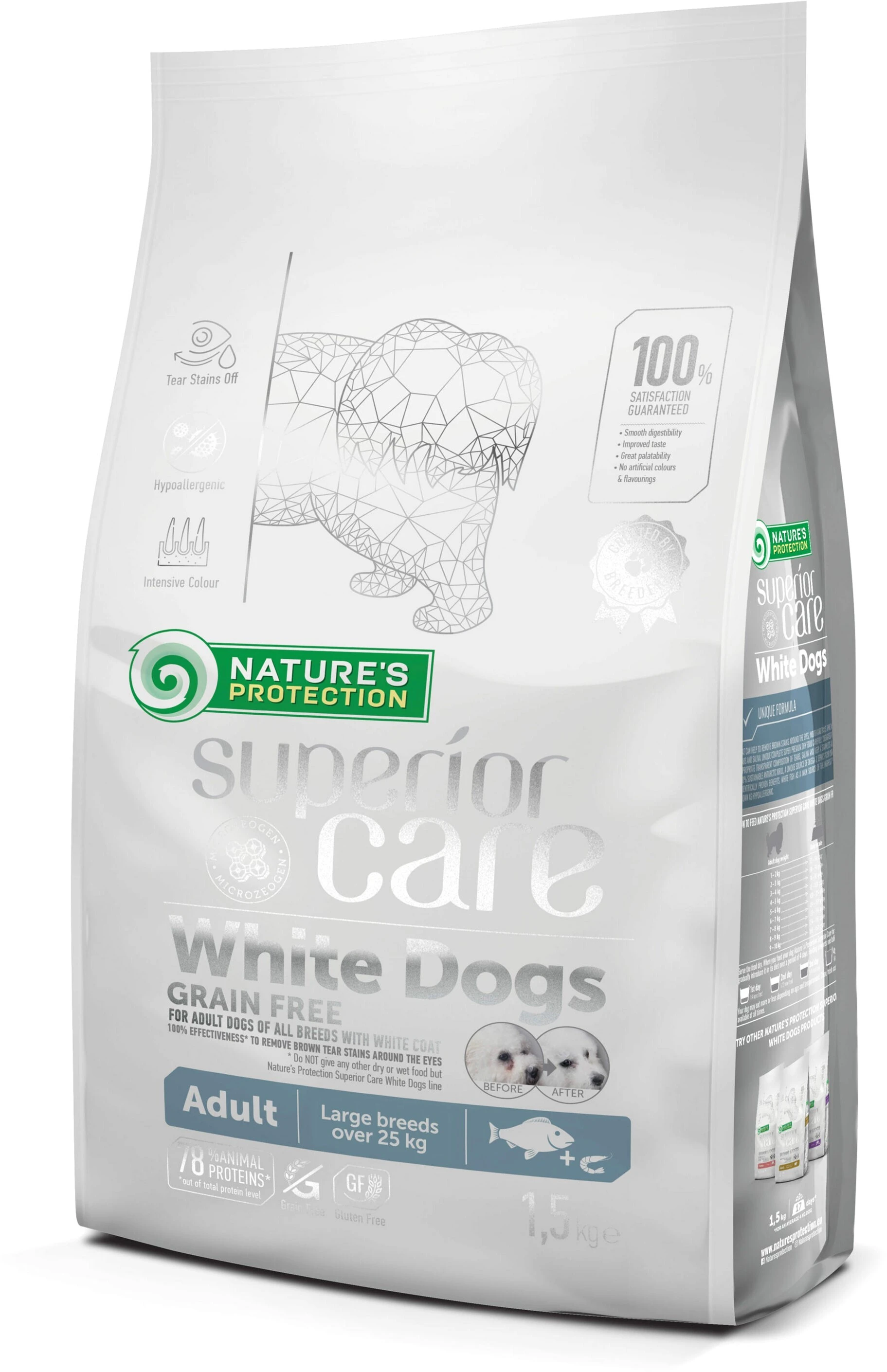 Склад: біла риба 41% (сушена та подрібнена), сушений картопля, батат, горох, жир птиці, борошно з криля (мін. 4%), жом цукрових буряків, лососеве масло, динамічно мікронізований клиноптилоліт (1%), насіння льону, фруктолігосахариди, екстракт юки, зелений чай, сушена календула (джерело лютеїну).